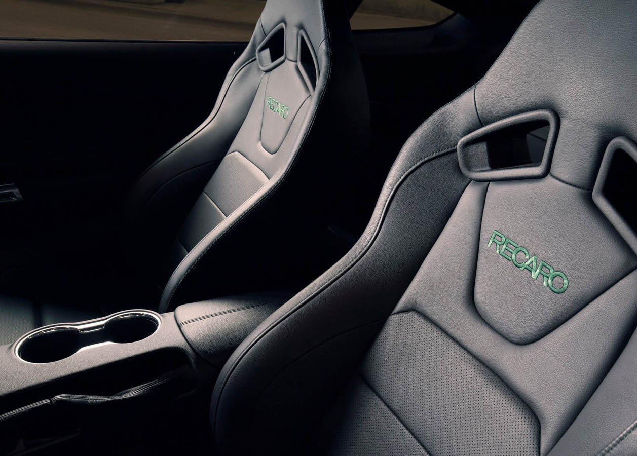 The leather-trimmed interior features unique green accent stitching on the dashboard, door panels, center console and seats.