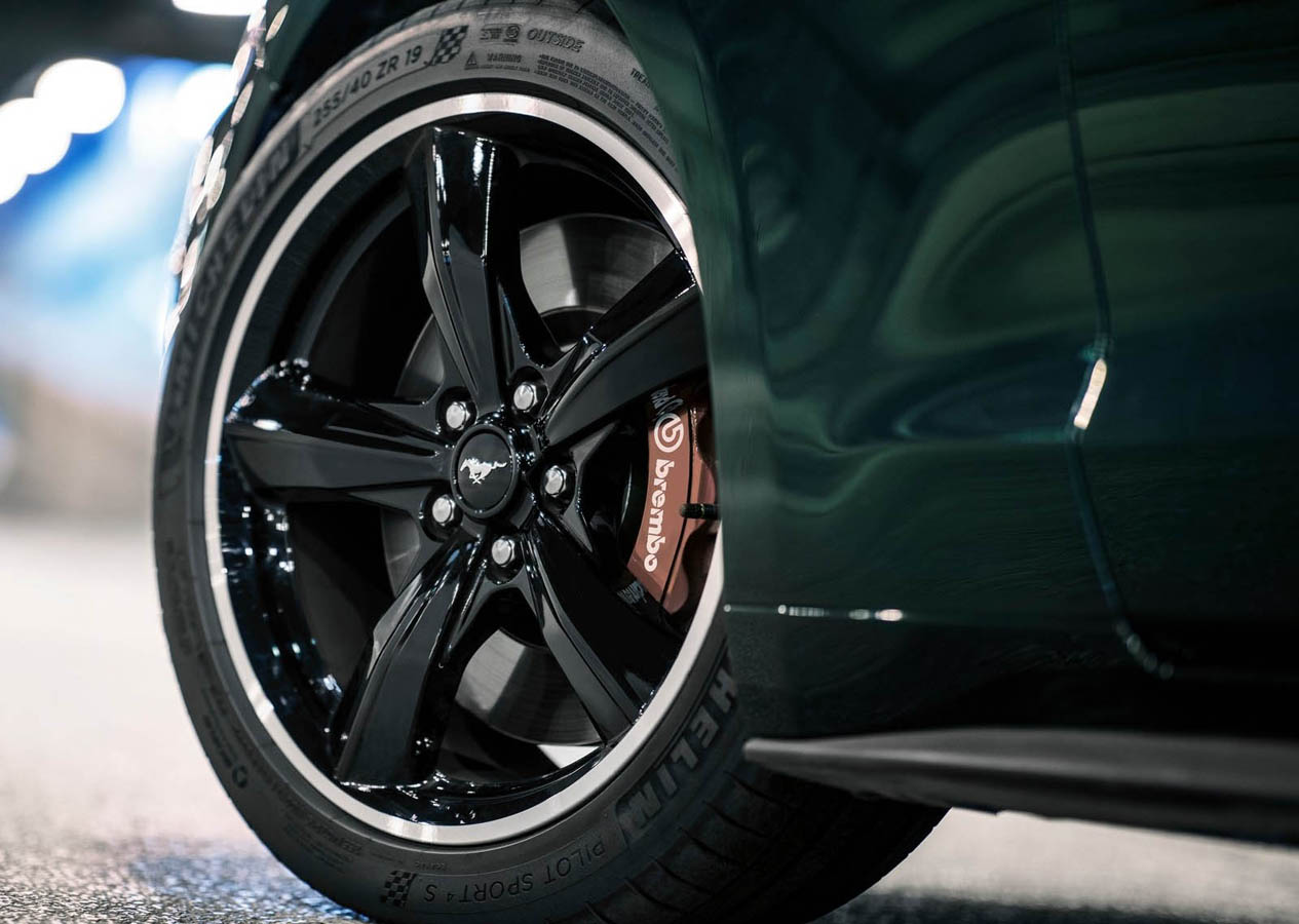 Exterior paint choices are limited to Shadow Black and the classic Dark Highland Green – as worn in the movie. Other features that pay tribute to the car McQueen drove are subtle chrome accents around the grille and front windows, classic torque thrust 19-inch aluminum wheels, red painted Brembo™ brakes, and a unique black front grille. Inside and out, the vehicle uses minimal badging; only the circular faux gas cap Bullitt logo on the rear center is visible on the exterior.