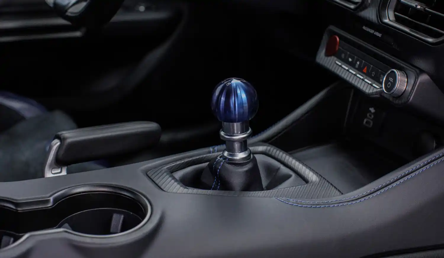 The available and class-first electronic drift brake* is leather-wrapped and features an anodized lever with precise action to help the driver easily modulate the rear wheels to a full lock while in track mode for sideways movement.