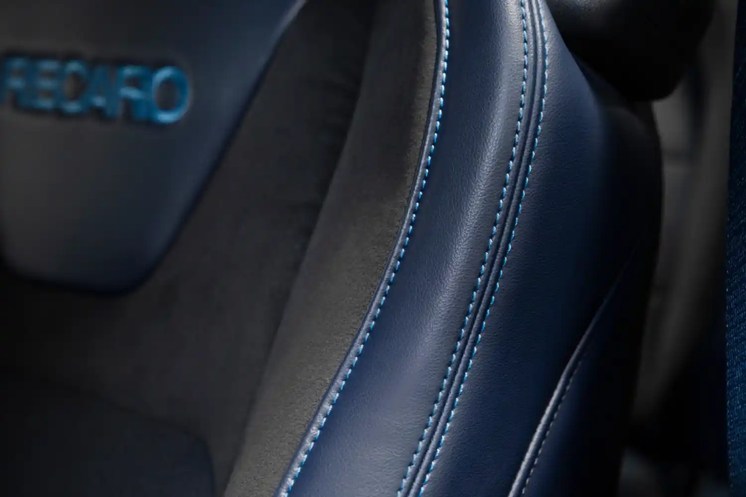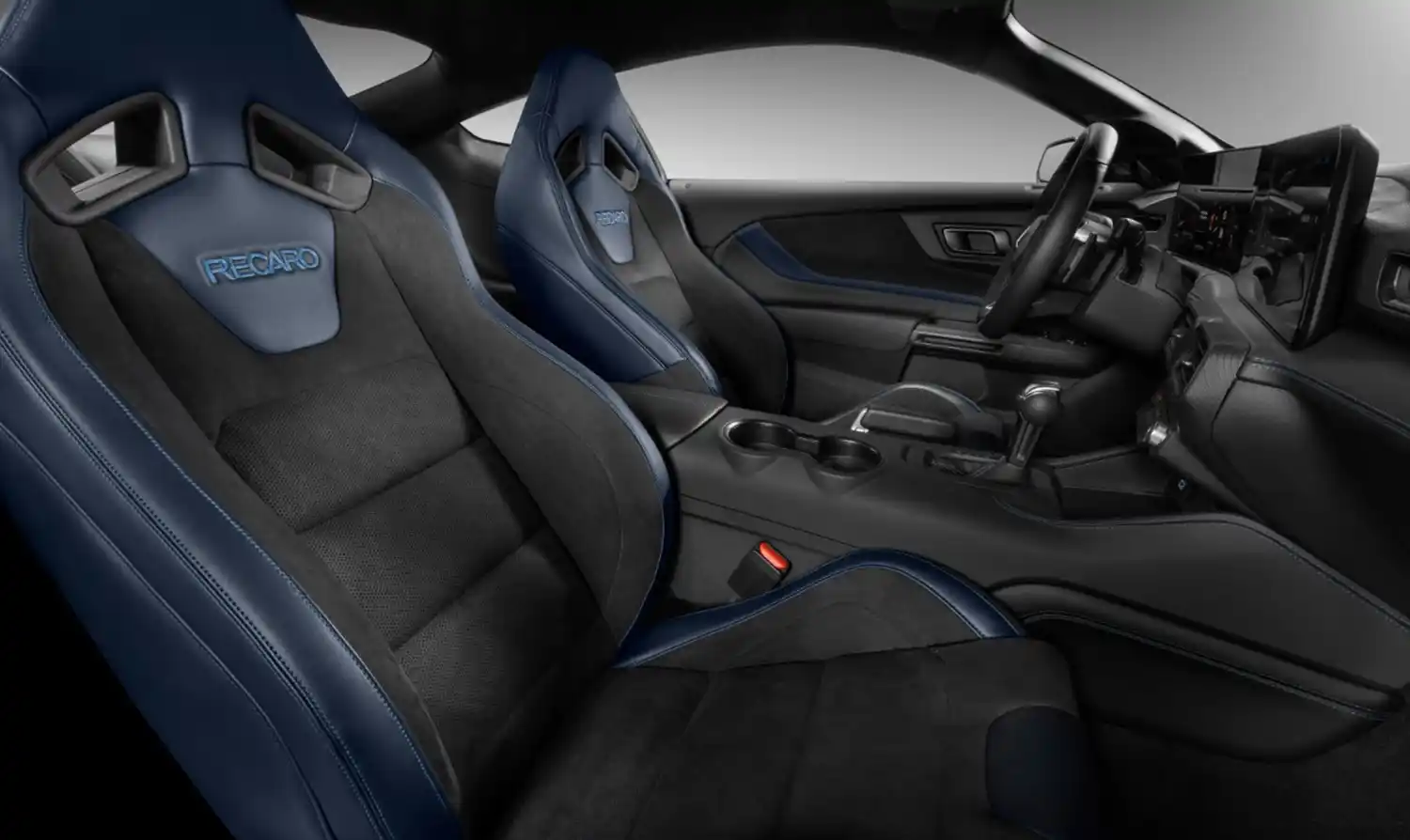 For customers who want an even more sporty look, the Mustang Dark Horse Appearance Package includes specially bolstered RECARO® performance seats featuring exclusive Deep Indigo Blue bolsters trimmed with Bright Indigo Blue accent stitching, plus black Dinamica suede in the seat’s center for improved lateral grip. Deep Indigo Blue seatbelts and distinctive seat perforations with blue accents beneath the seating surface round out the blue theme.