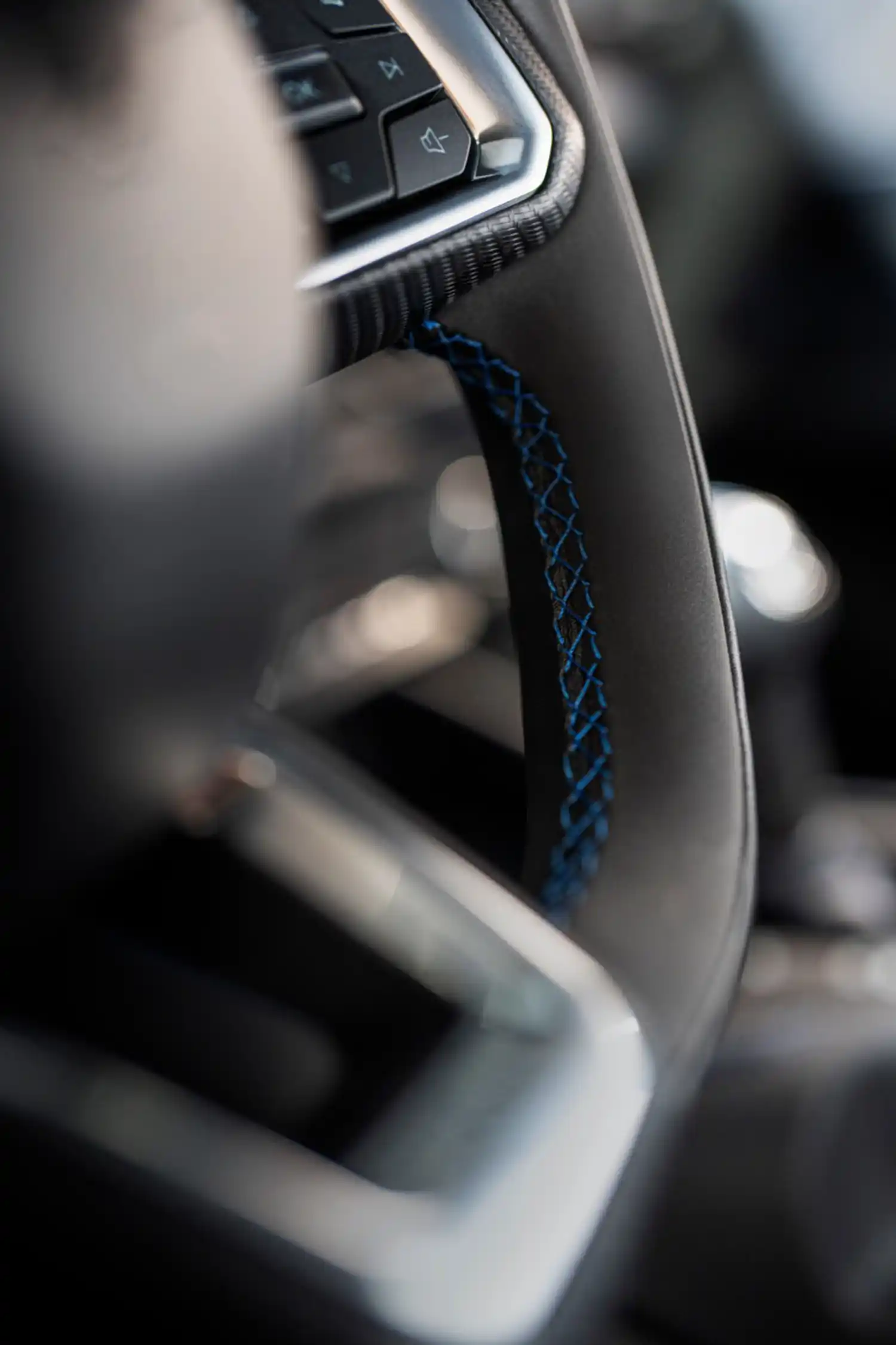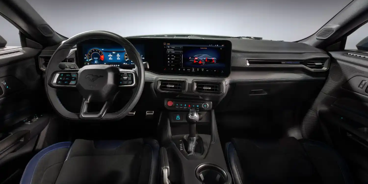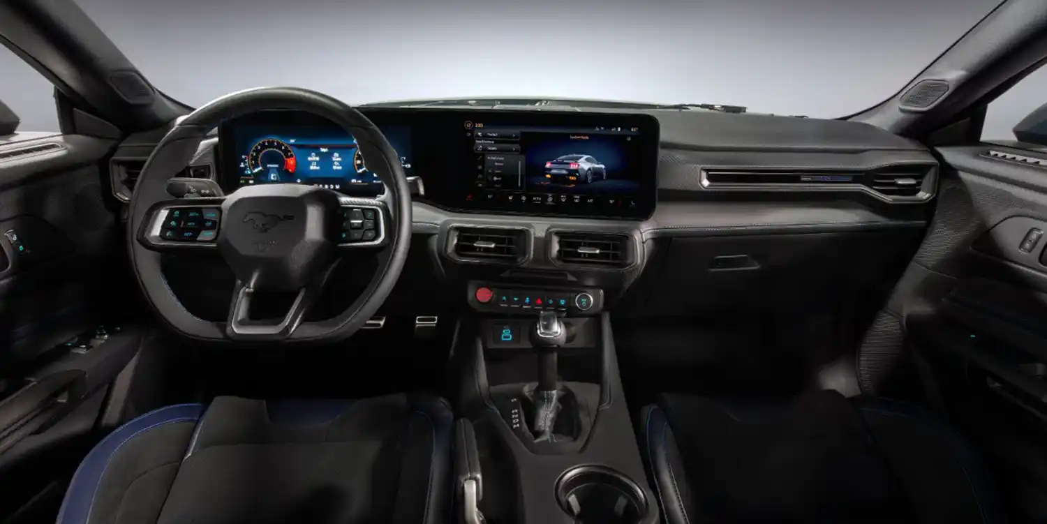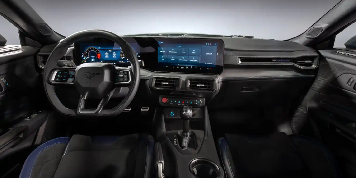 Mustang Dark Horse features a flat-bottomed steering wheel uniquely wrapped in performance suede for added grip, while contrasting Bright Indigo Blue stitching adds detail across the instrument and door panels, seats, gear shift boot and center console trim and lid. The sport-contoured steering wheel enhances the digital experience with buttons that control vehicle functions like drive mode selection, the instrument cluster and 13.2-inch SYNC® 4 center stack, which is elegantly angled toward the driver behind a single piece of integrated glass.