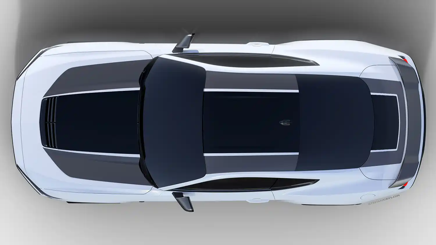The vinyl graphics accentuate the raised center of the hood and the low gloss Tarnished Dark and gloss black finish matches Dark Horse-specific parts on the vehicle. The Appearance Package gets a specialized hood vinyl graphic that builds on the base Dark Horse graphic but visually ties into the black-painted roof. In addition, a third vinyl accent color of low gloss black gives the Dark Horse an even more threatening look.
