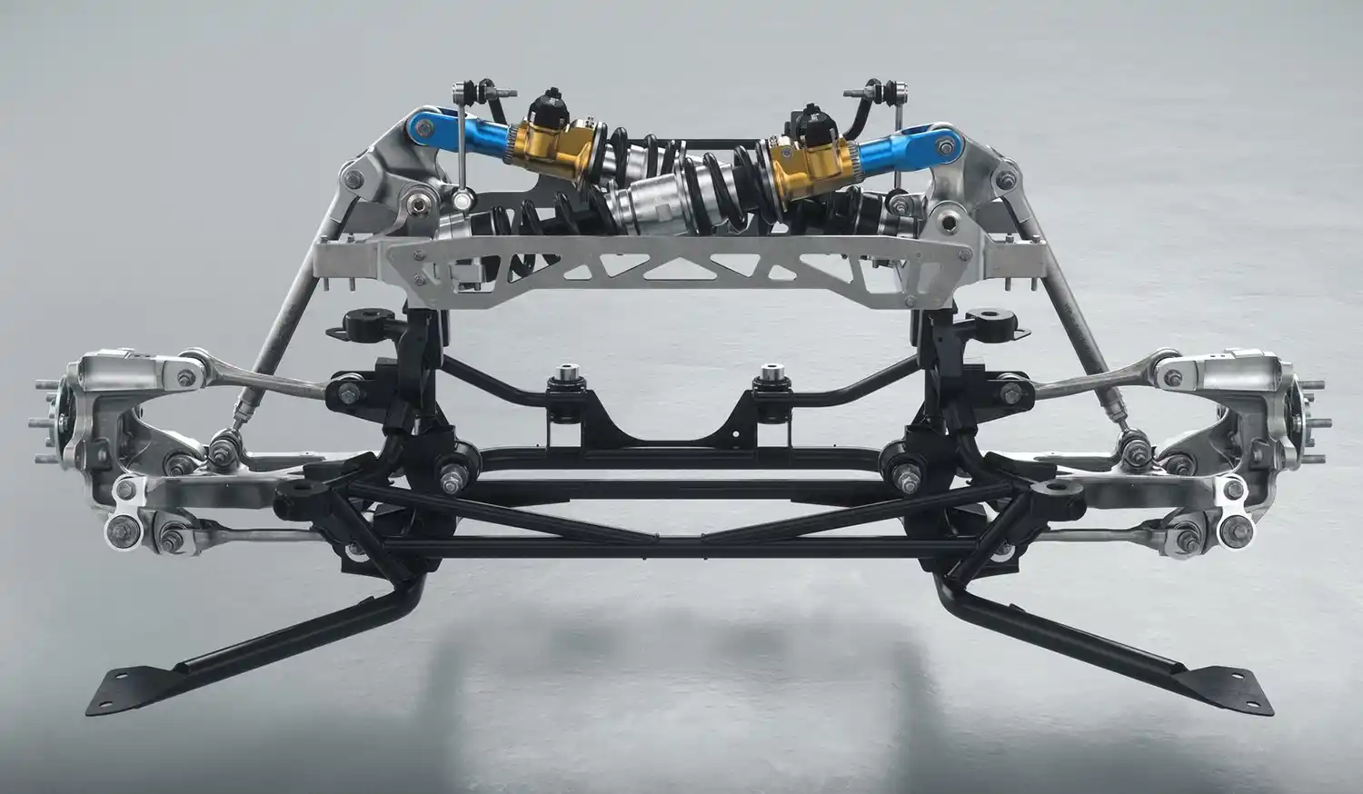 A short-long arm front suspension provides enhanced lateral stiffness and improved kinematics especially in high-G cornering. The rear suspension features an integral link pushrod and rocker arm architecture where the inboard Adaptive Spool Valve shock absorbers and coil over springs are arranged in a horizontal cross pattern and integrated with a strong, stiff, and weight-efficient motorsport-style tubular subframe. The unique architecture creates a motion ratio from pushrod to damper of 1:1 so the car responds precisely to track conditions.