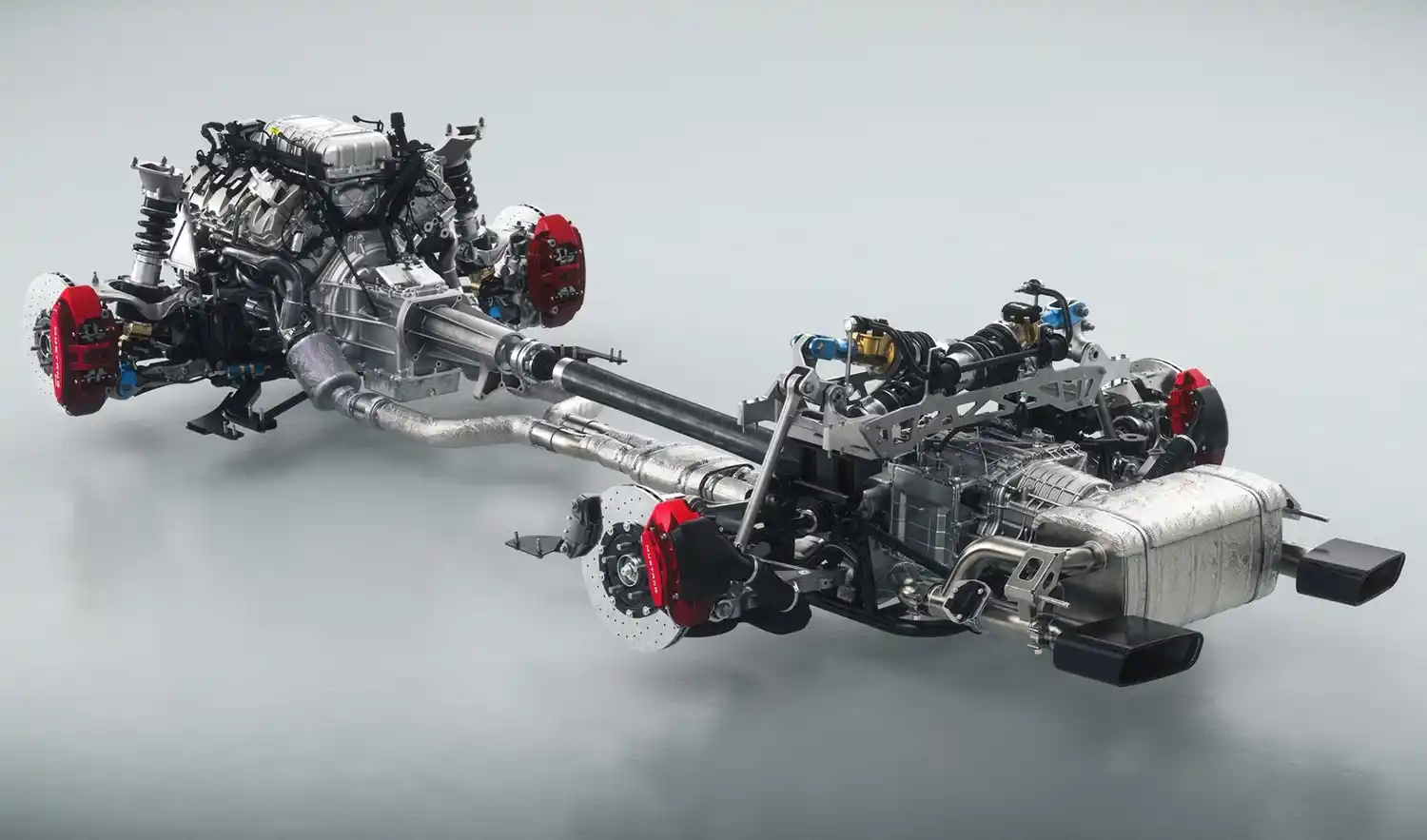 All of that power is sent from the engine to the rear wheels through a carbon fiber driveshaft connected to an 8-speed rear transaxle for near 50/50 weight distribution between the front and rear. Lap time drive simulations and powertrain dyno testing led to the selection of the powertrain and transaxle architecture to put power to the ground.