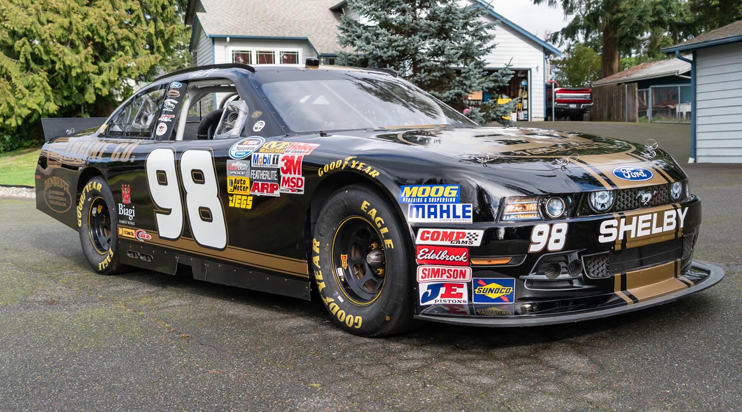 The Ford Mustang NASCAR Race Car built by Roush Fenway and campaigned by Mark Martin in 2005 and 2006 is crossing the block at no reserve. Originally bodied as a Taurus, the tube-frame chassis now wears Mustang-style panels finished in black with gold Shelby Super Snake graphics.