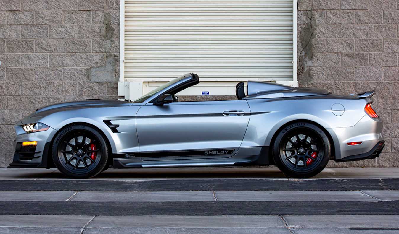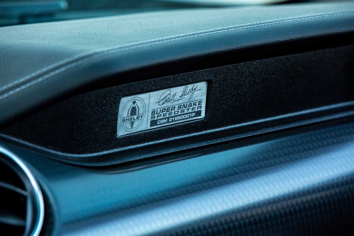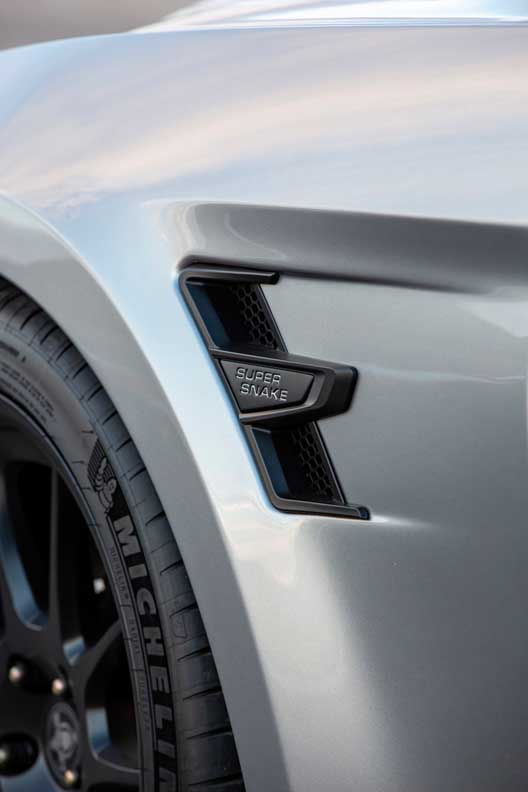 New for 2021, Shelby will offer a total of 98 “Speedster” edition Super Snakes for the US market. The Shelby Super Snake Speedster transforms the car into a two-seat roadster; it includes a convertible tonneau and unique striping, as well as special floormats and door sill plates. The impressive options for all Super Snake models are painted stripes, a wide body package, Penske track suspension and rear seat delete with harness bar. MSRP for the optional package is $4,995.