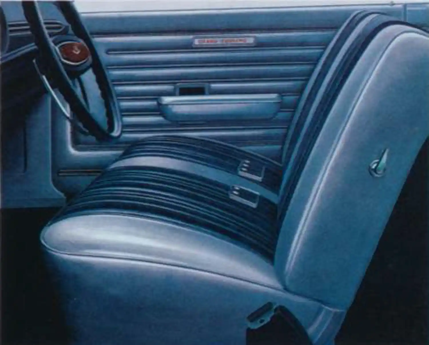 All Torinos included full colour-keyed carpeting, additional exterior and interior trim over a Fairlane, and Torino crests on the ‘C’ pillar. The Torino GT’s standard features included special name plaques and exterior trim, GT markings on wheel covers and courtesy lights on the inside door panels. Initial sales literature showed that bucket seats were standard equipment.