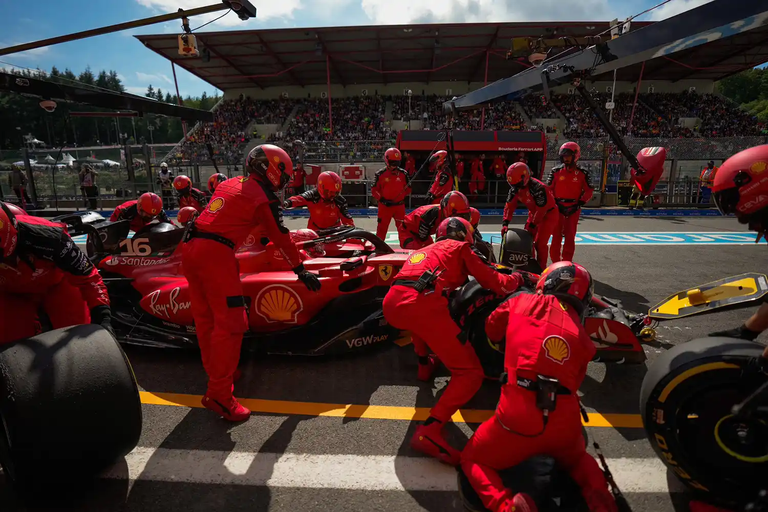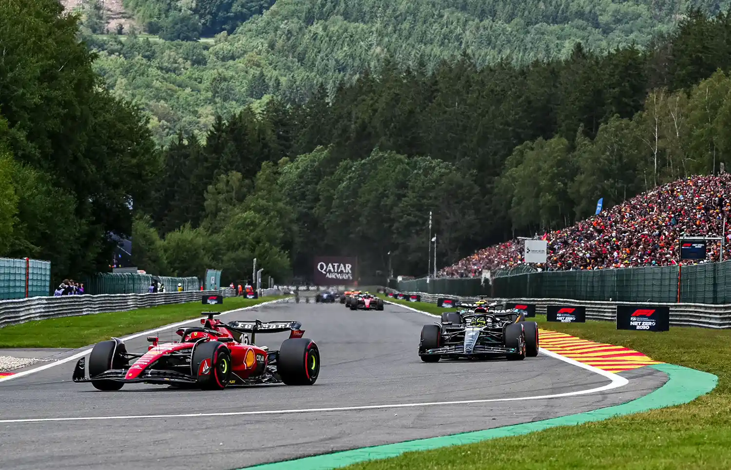 At the start, Leclerc made a good start from pole position to take the lead into La Source ahead of Pérez who defended aggressively to keep Hamilton at bay. Behind them, though, there was contact when Ferrari’s Carlos Sainz, starting fourth, locked up into Turn 1 and squeezed McLaren’s Oscar Piastri into the wall on the inside. Both cars were damaged in the incident, with Piastri forced into retirement later in the lap, while Sainz was able to limp on.