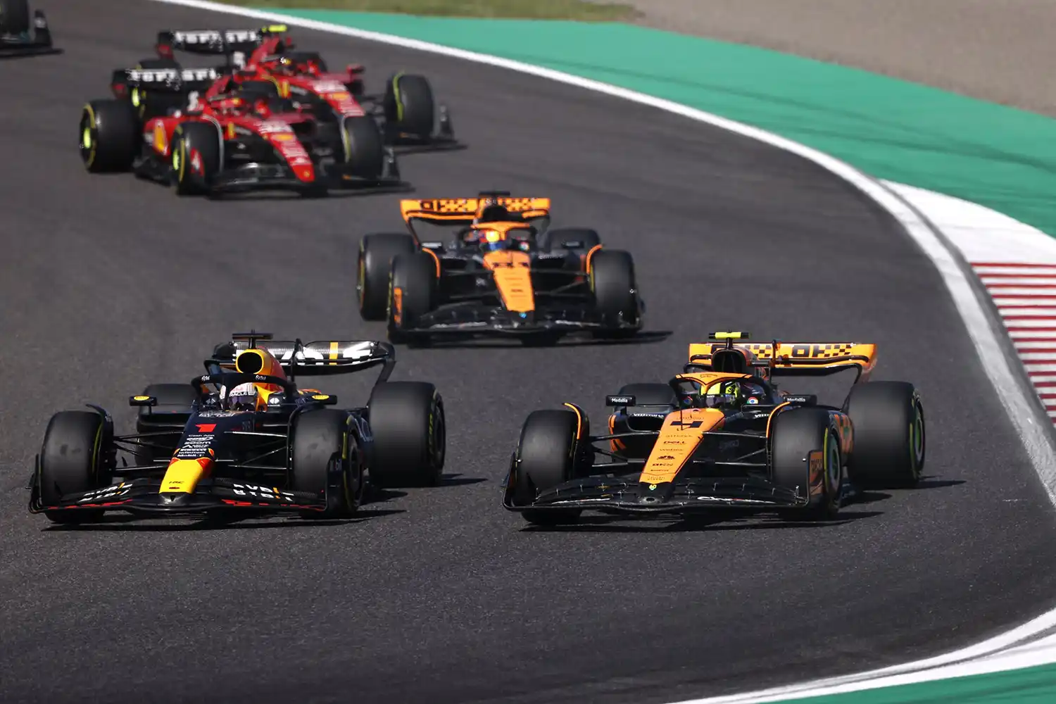 When the lights went out for the start, Verstappen got away well and despite pressure from Piastri to his right, the Dutchman placed his car well to block the McLaren. That left Piastri vulnerable, and spotting the opportunity, Norris powered through to steal P2 from his team-mate.