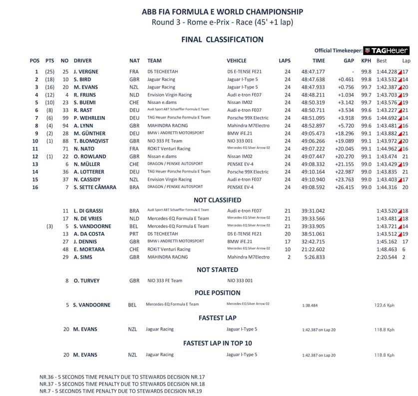 Bird, indeed, was arguably the biggest winner of the day, as the runner-up spoils vaulted him into a nine-point championship lead. The Briton was a man on a mission throughout, pulling off a series of spectacular passes. Both he and Evans battled impressively by de Vries as they worked their way into podium contention, with the latter picking up an extra point for posting the TAG Heuer Fastest Lap.