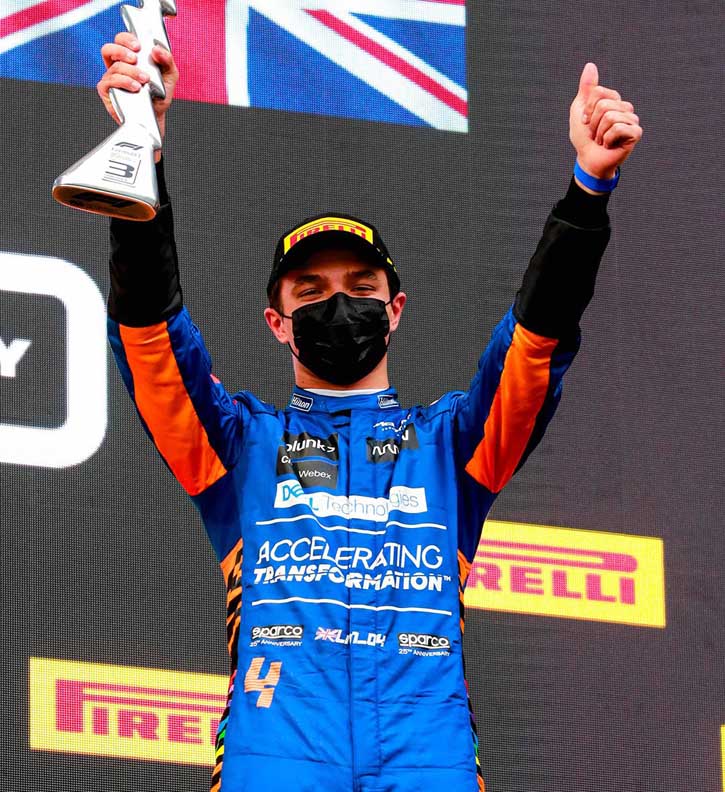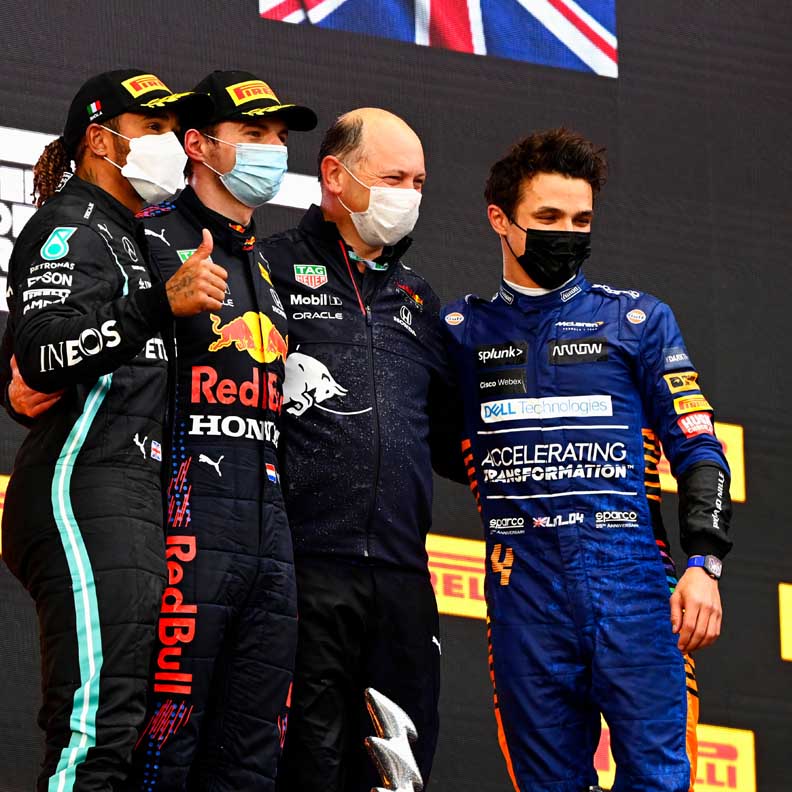 Norris’ gamble on soft tyres for the re-start paid off too. Although he was unable to jeep Hamilton at bay in the final laps, the McLaren driver nursed his fading tyres to the flag in third place to take his second career podium finish.