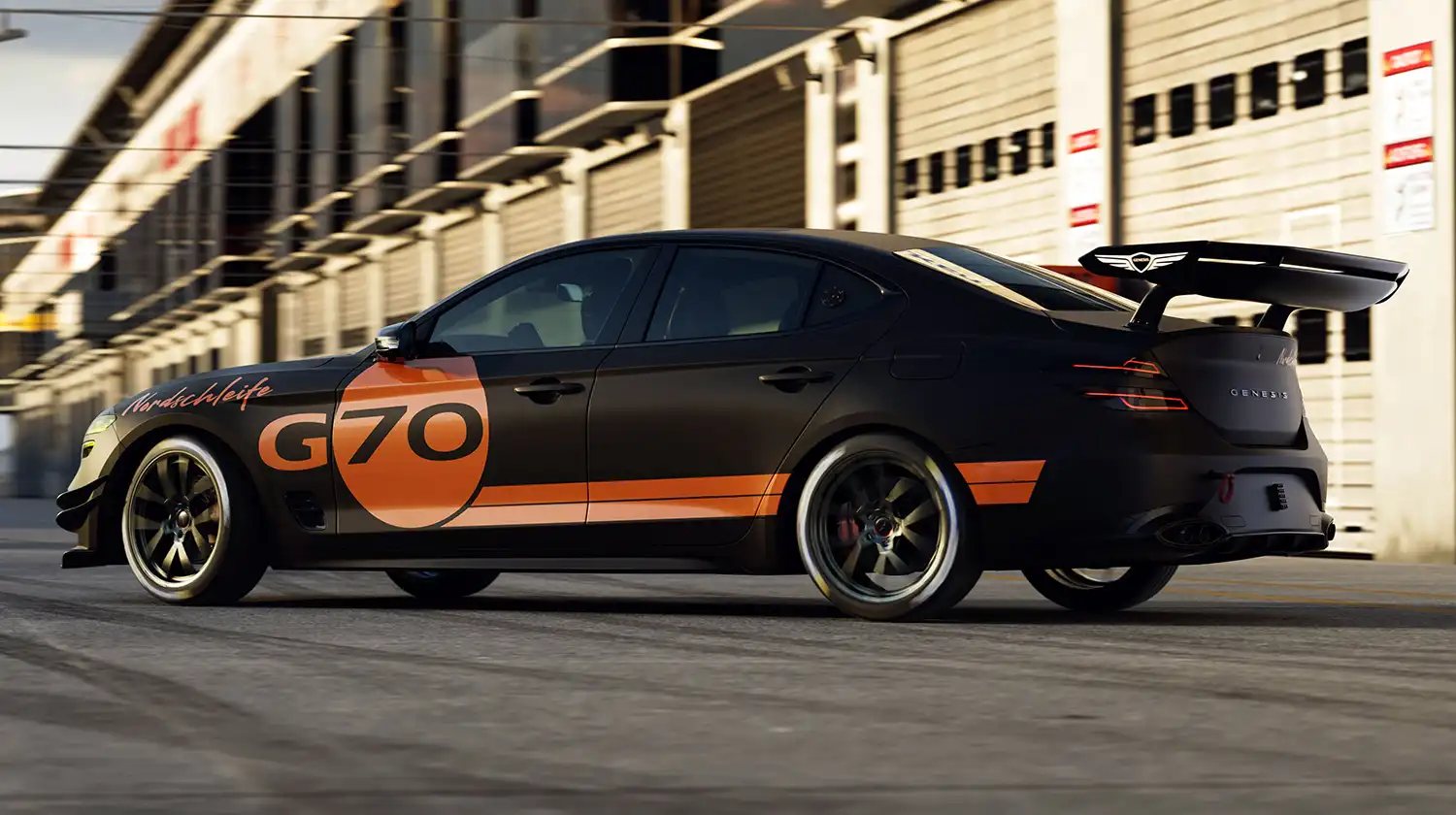 Design and Inspiration: The G70 Track Day Special Concept is visually inspired by the low and sporty stance of the G70 Track Taxi. It features several unique body enhancements, including hood air vents and prominent front and rear tow cables, contributing to its aggressive and track-ready aesthetic. A striking rear wing is incorporated to optimize aerodynamics, crucial for high-speed stability and cornering. The concept also features “Nordschleife” graphics on the front fenders and rear, directly referencing its connection to the legendary German racetrack. Its livery presents a bold new look while maintaining visual harmony with the original orange-colored G70 Track Taxi, offering a fresh interpretation of the performance-focused design.
