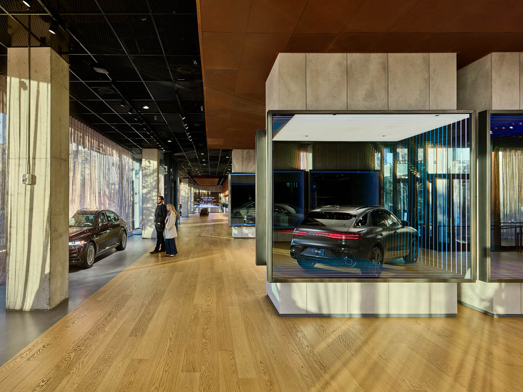 - Showroom: The main floor offers guests an opportunity to experience the latest Genesis vehicles in a relaxed environment. Suh Architects framed Genesis vehicles as finely crafted objects of desire, using reflections from a tessellated mirror display to amplify their seductive engineering. These glass cases of telescoping linear light are hung on surfaces of exposed concrete, creating a unique art installation. A juxtaposition of raw materials and refined engineering characterizes the interior envelope throughout the showroom. Metallic mesh curtains are one of the distinct first-floor features. A shimmering perimeter of translucent copper envelops the Genesis House at street level, beckoning visitors to bring their curiosity indoors. Once inside, the veiled machines are revealed as the latest models of state-of-the-art engineering, highlighting key Genesis elements such as the Parabolic Line and Two Lines design cues. Finally, a flip-dot wall installation comprised of over 91,000 metallic discs draws visitors in with its copper waves of swirling patterns.