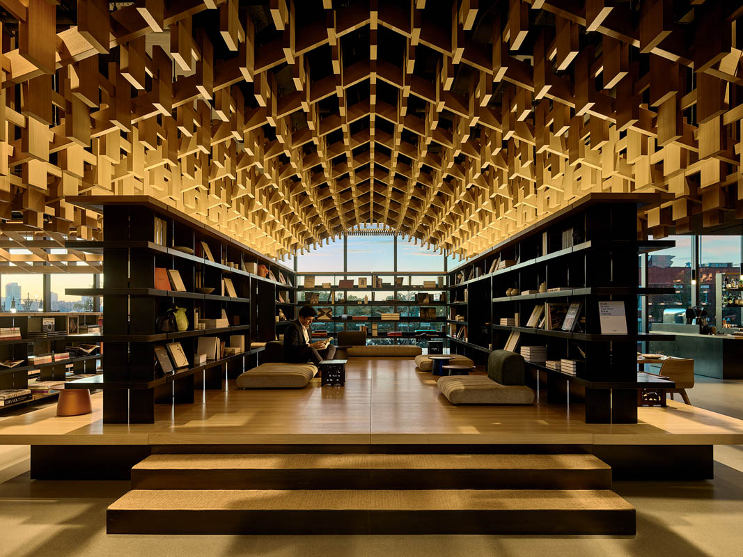 - Tea Pavilion curated by Arumjigi: Inspired by the tastes of connoisseurs, the Tea Pavilion is a veranda-like living room space featuring customized boryo floor seating where guests are traditionally received by their host. The pavilion borrows motifs from the chaekgado painting style to visualize the philosophy of virtuous scholars known as seonbi. Serving as walls to enclose the space, a gridded bookshelf was designed to showcase collectibles such as monographs, writing and musical instruments, ceramics, and other artifacts related to the leisurely lives of seonbi. The windows of this library pavilion frame panoramic views of the Hudson River and the High Line beyond, which guests can enjoy while reading and sipping tea. Led by a trained tea specialist, the Genesis House Tea Ceremony will serve as a symbolic experience of hospitality as Genesis House welcomes its guests to refresh and recharge.