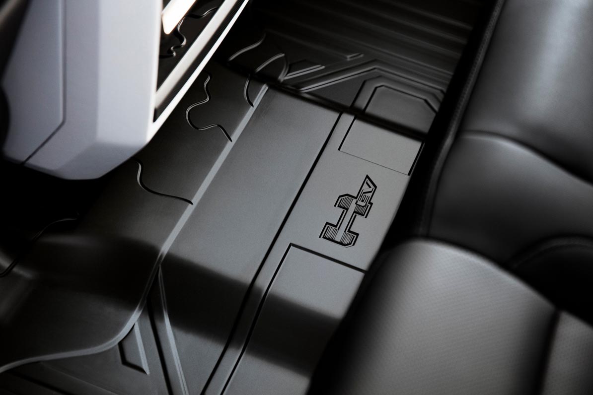 There’s no conventional carpet in the interior, either. A versatile and easy-to-clean vinyl floor, topped with rubber flooring made from recycled material, is functional and instilled with distinctive design elements. Rubber inserts for each passenger position are designed for easy removal and clean up after a day on the trail.