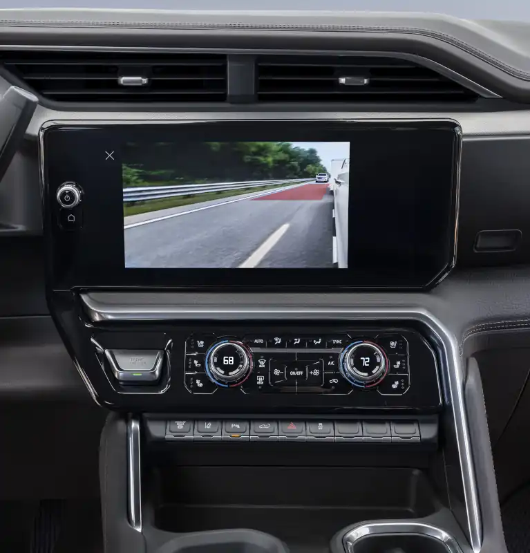 - Bed View with Zoom and Bed Hitch Guidance6: Allows you to see the cargo bed to help with fifth-wheel or gooseneck hitching or to briefly check on cargo.