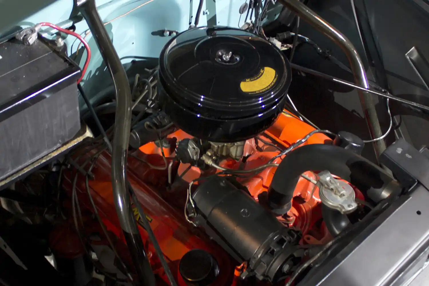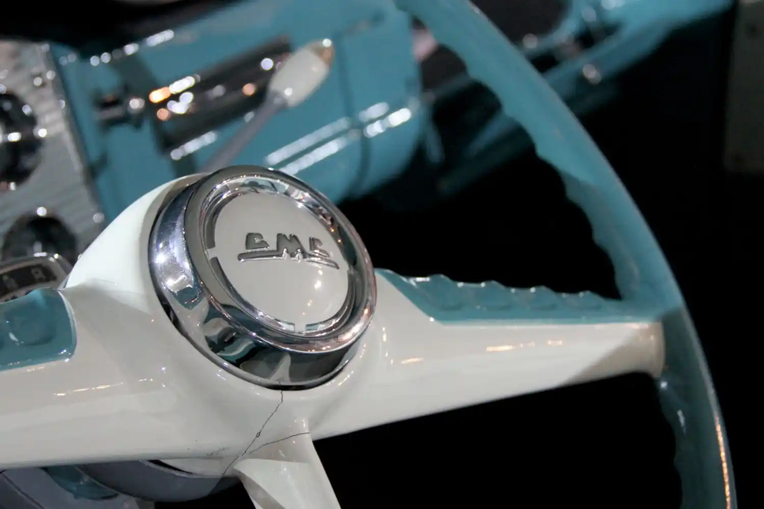 The truck features fiberglass fenders attached to a steel cargo box with a hidden spare tire compartment. This suburban is fully optioned with the Deluxe Cab, chrome bumpers and grille, WSW tires, V8 engine and 4- speed Hydra-Matic transmission.GMC produced the Suburban from 1955 through 1957 and total production was close to 1,000 units.