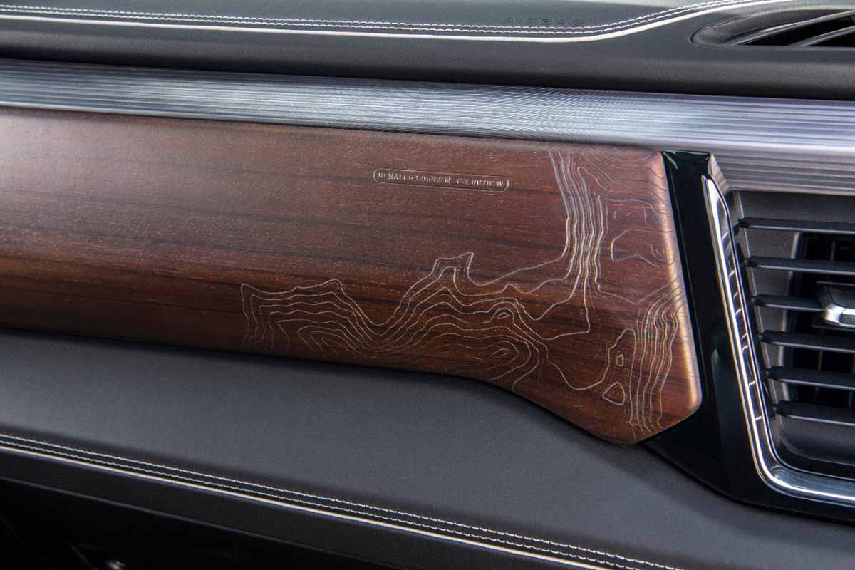 The Denali Ultimate’s Alpine Umber interior builds on the already luxurious Denali cabin, with full-grain leather instrument panel, door panels, console lid and seats, paired with open-pore Paldao wood trim. The wood’s darkened finish creates a distinctive color blend, while the unique graining adds bespoke attention to detail. Embossed and laser-etched into the wood on the dashboard and on the seats, are topographical maps of Mount Denali, the highest peak in North America and the namesake of this iconic truck.
