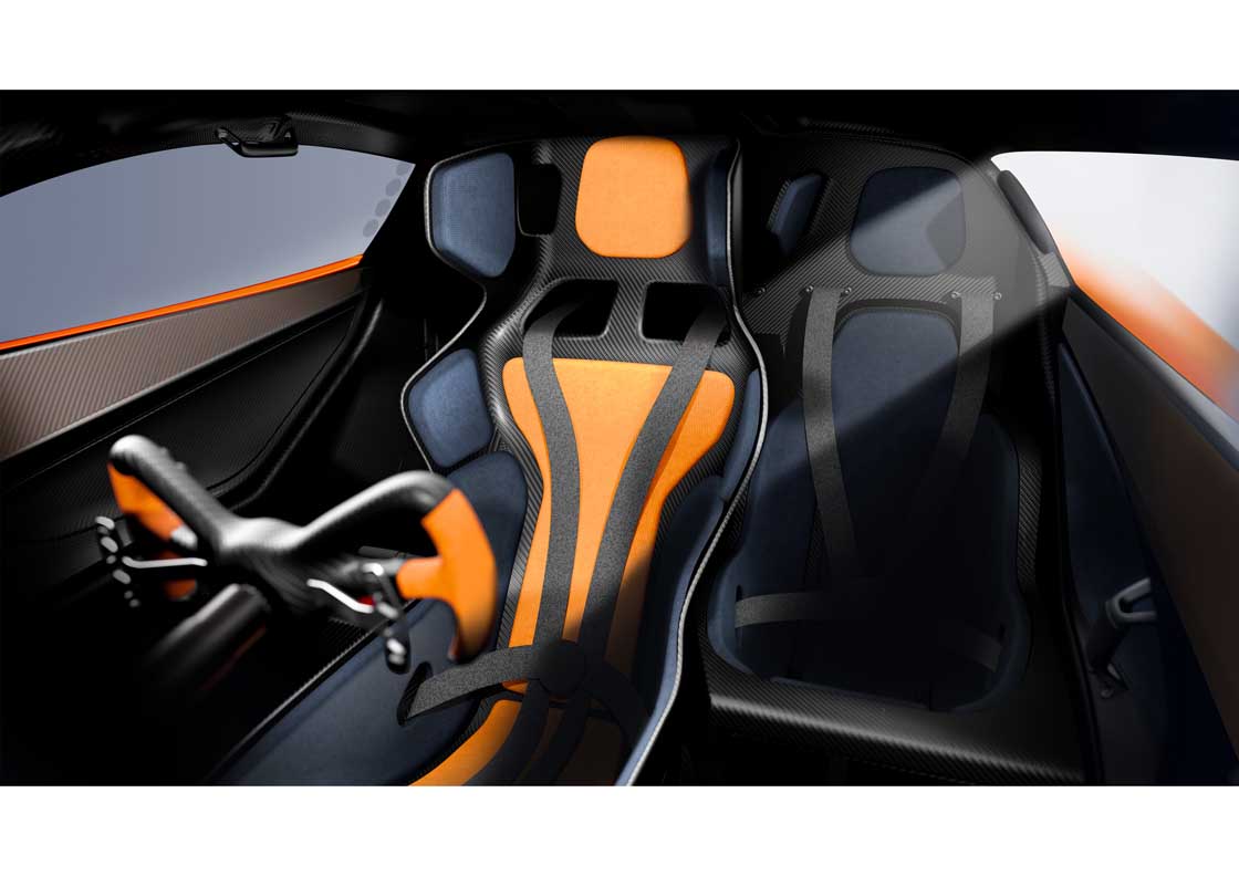 The rectangular carbon fibre steering wheel is a lesson in simplicity, featuring only the key controls that the driver needs. This includes buttons for the traction and launch control, as well as the car-to-pit/driver-to-passenger radio and to select neutral. The slim, uncluttered design is influenced by Murray’s racing experience.