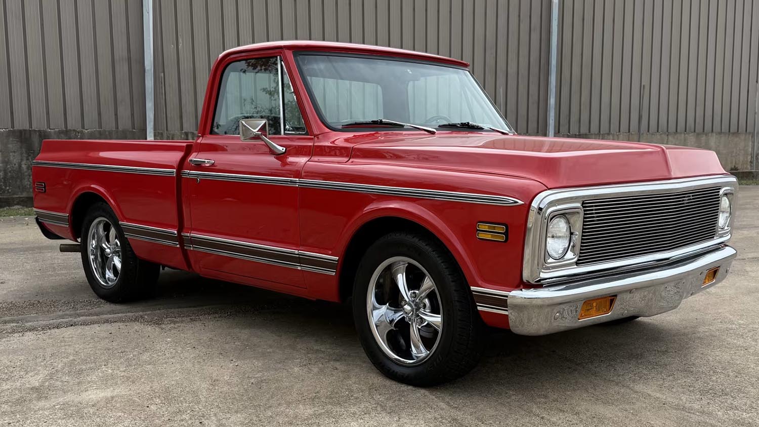 The 1972 Chevrolet C10 Pickup stands as the final and most refined year of the legendary Action Line series. This specific custom build wears a vibrant red paint that emphasizes its classic, square-shouldered silhouette. It has been transformed from a humble workhorse into a high-performance street machine with significant mechanical upgrades. Only 1,643 miles are shown on the odometer, suggesting a fresh life after its comprehensive restoration. This truck captures the perfect balance between vintage American heritage and modern driving conveniences. Enthusiasts often consider the seventy-two model the most desirable year for this iconic Chevy generation.