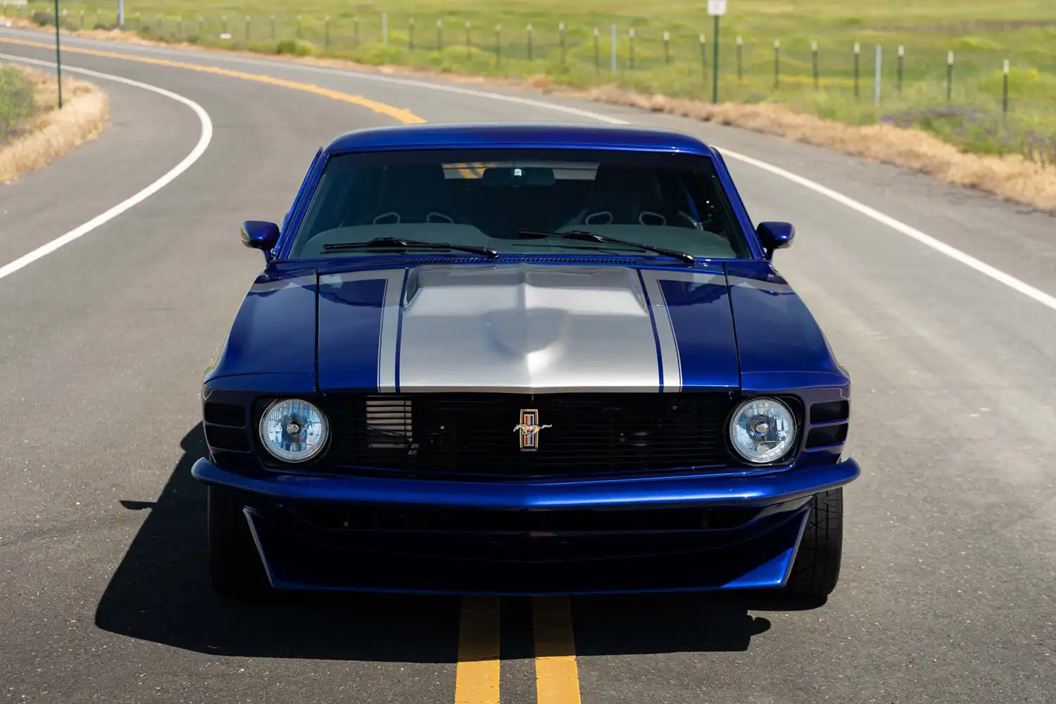 Striking Custom Exterior: The body of this 1970 Mustang SportsRoof has been meticulously smoothed and refinished in a vibrant metallic blue, accented by a silver-painted hood scoop, distinctive hockey-stick stripes along the sides, silver-painted rear-window louvers, and matching taillight bezels. During the custom build, the deck lid and doors were shaved for a cleaner look, and the bumpers and front spoiler were painted to seamlessly match the body color. The overall effect is a sleek and aggressive aesthetic that blends classic Mustang lines with modern custom touches. The selling dealer notes some paint blemishes, which are detailed in the photo gallery.