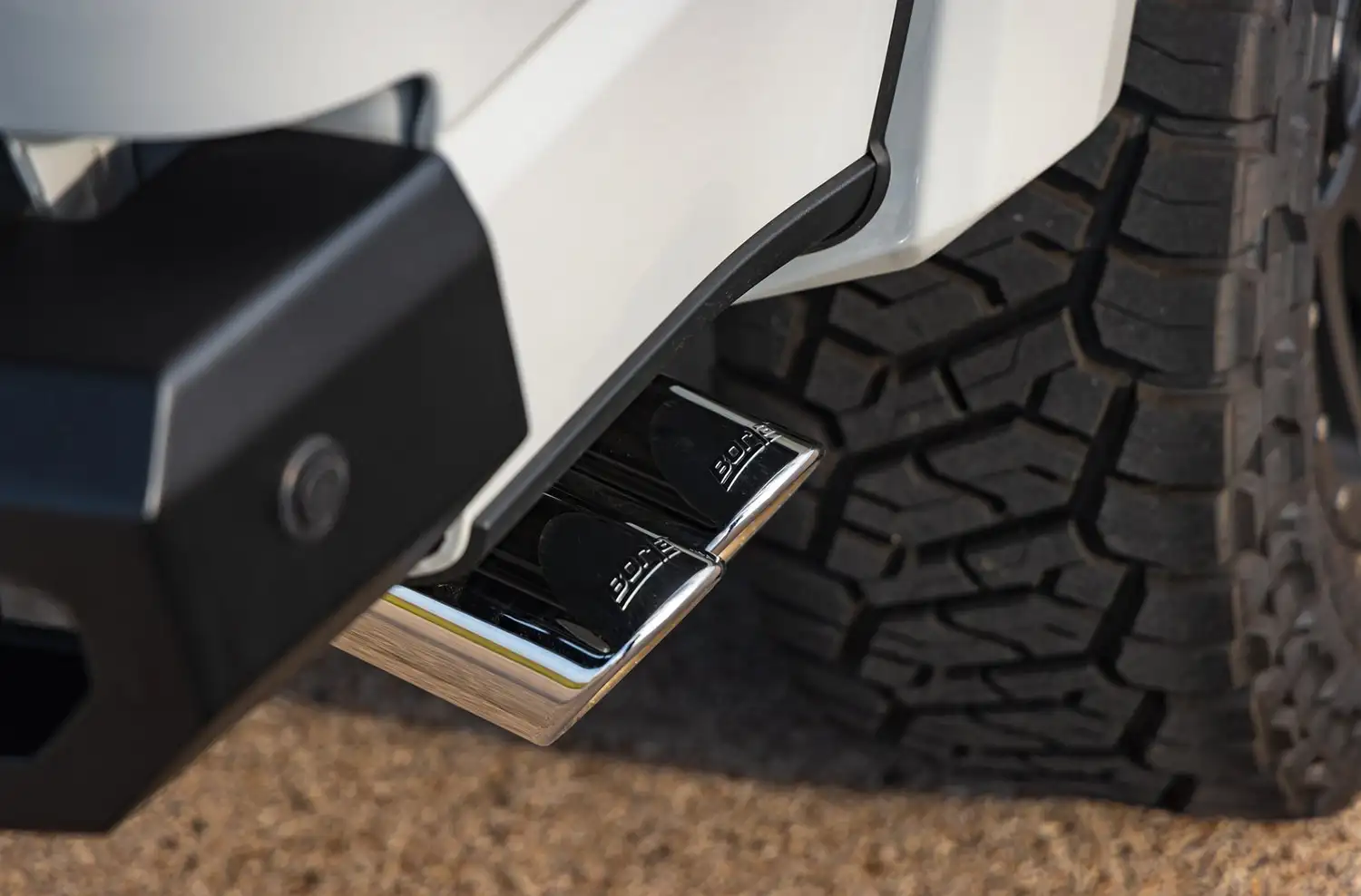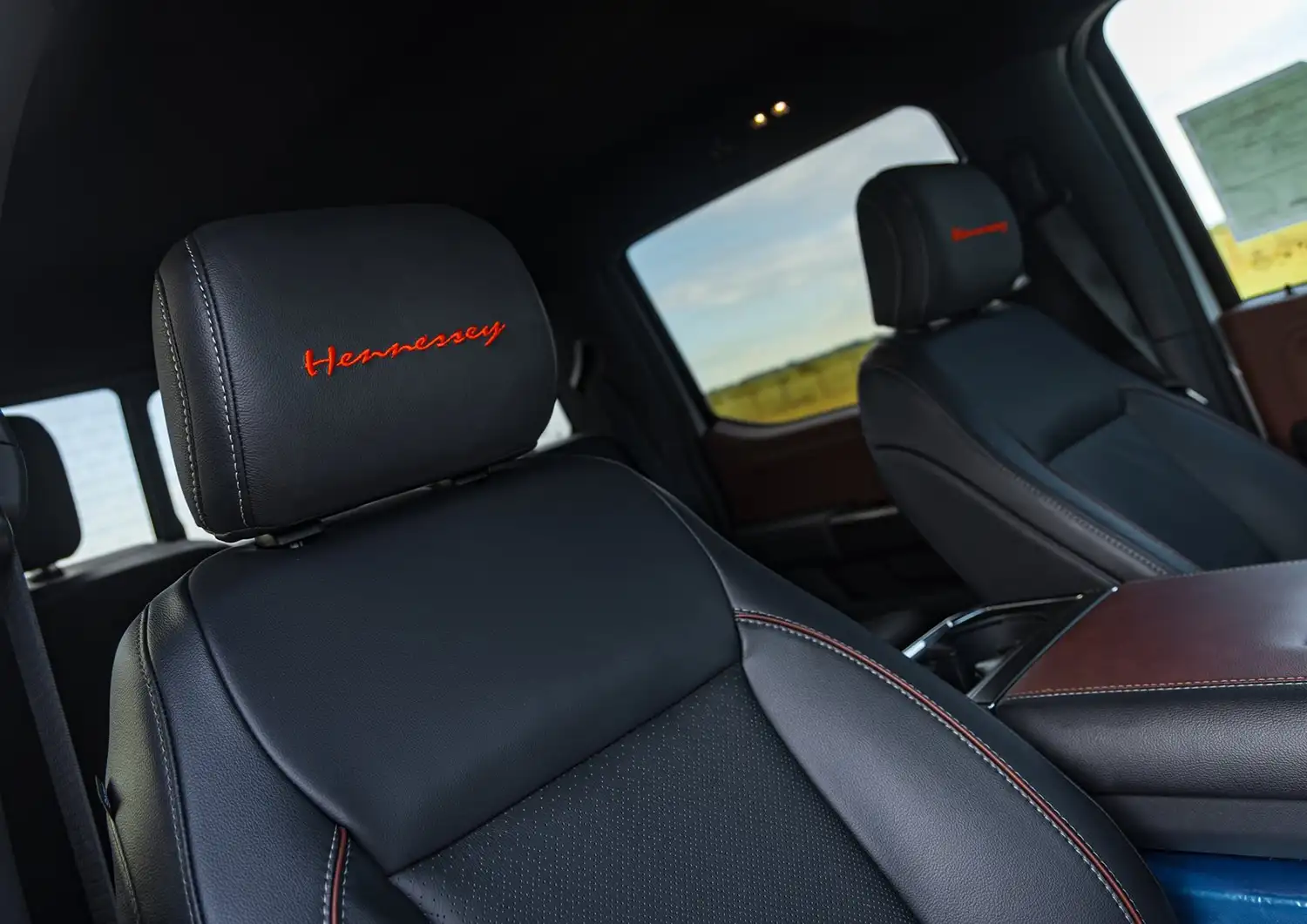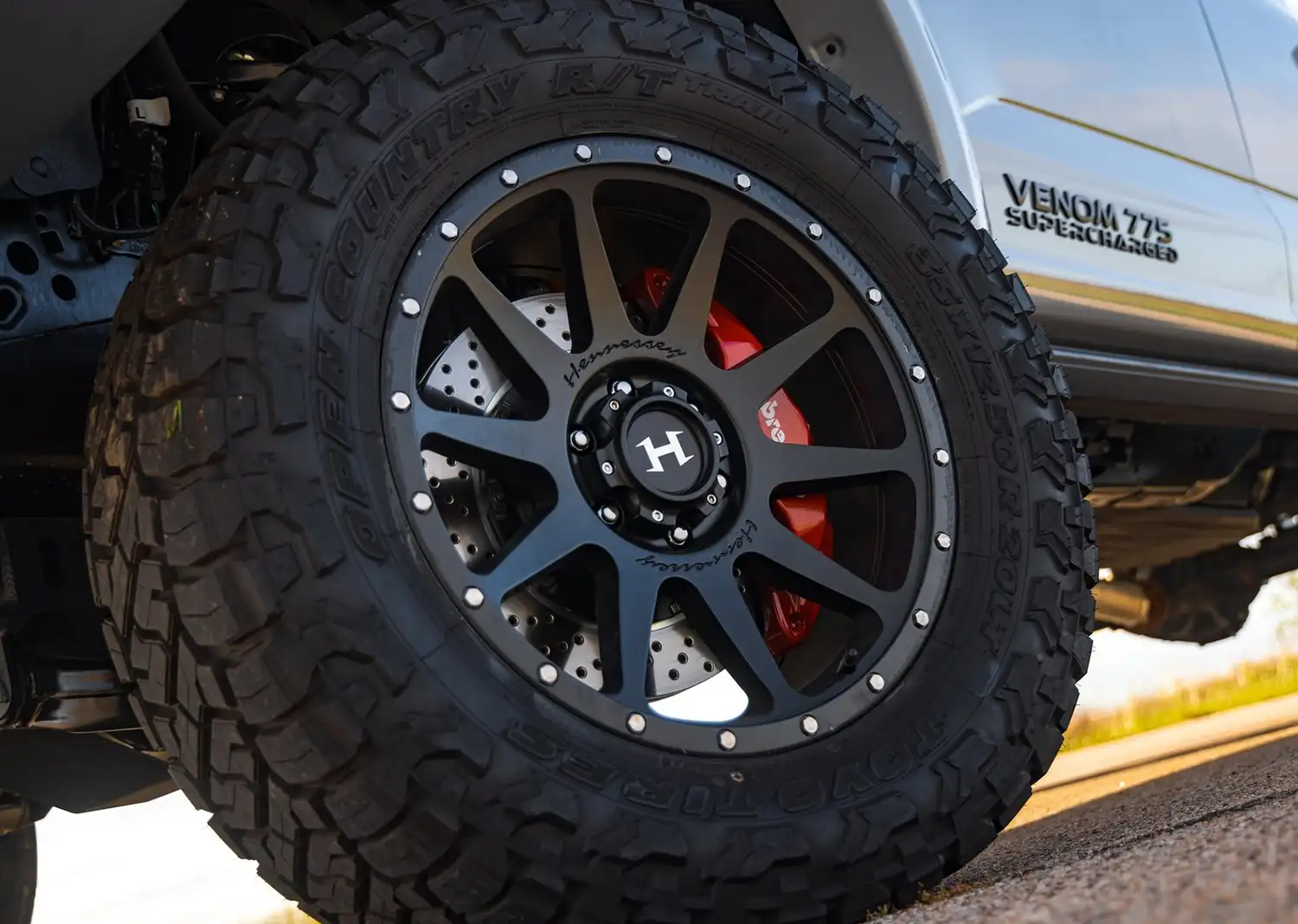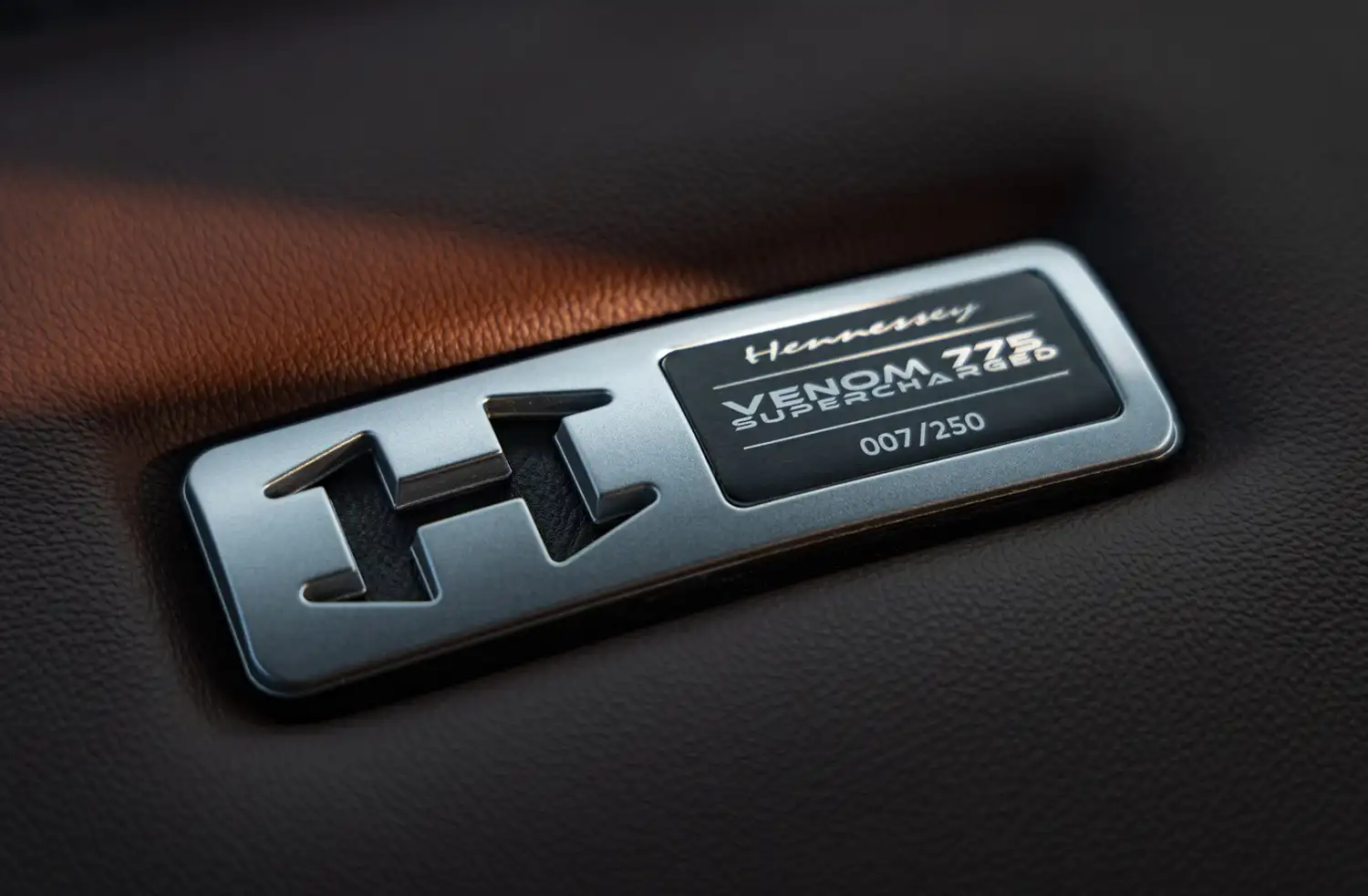 Improving the chassis, Hennessey adds a 6-inch lift with 20-inch ‘Hennessey’ 10-spoke alloy wheels wrapped in 35-inch off-road tires to enhance off-road capabilities. The suspension is upgraded, and multi-piston Brembo brakes with red calipers shorten stopping distances and add visual impact. A ‘Hennessey Venom’ front bumper, with LED illumination, is matched to the ‘Hennessey Venom’ bumper on the rear. Power-operated AMP running boards ease ingress and egress. Uniquely, the front badge and fender vents are illuminated for distinctiveness, and the interior is enhanced with embroidered ‘Hennessey’ head restraints and unique Venom 775 badging.