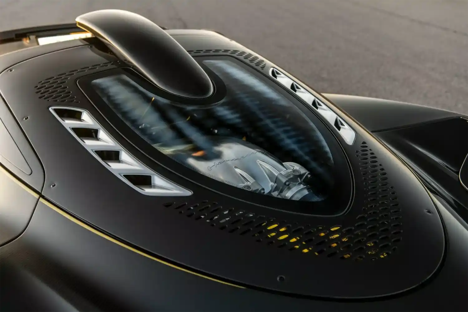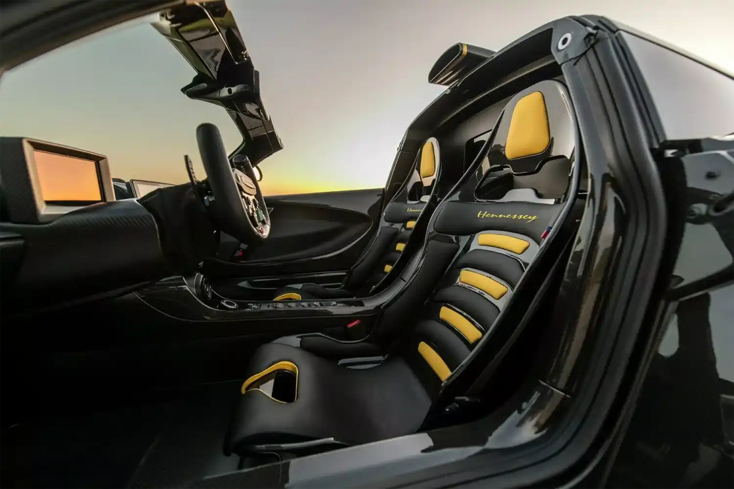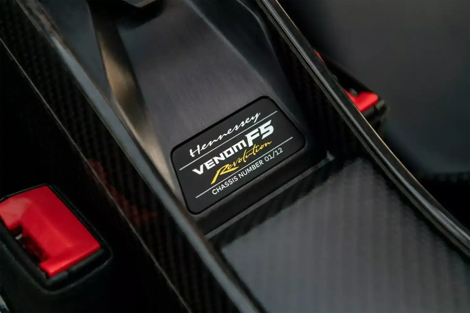 Paralleling all other Venom F5 models, mid-mounted in the carbon-fiber monocoque chassis is Hennessey’s celebrated twin-turbocharged, 6.6-liter, ‘Fury’ V8 combustion engine rated at an astonishing 1,817 bhp. As with the F5 Roadster, the Venom F5 Revolution Roadster features a robust tempered glass engine viewing window as standard to spotlight the formidable powerplant. The glass, about four times stronger than ordinary annealed glass, is encapsulated within a removable carbon fiber engine cover that features intricately milled heat extraction holes that match those in the rear bumper.