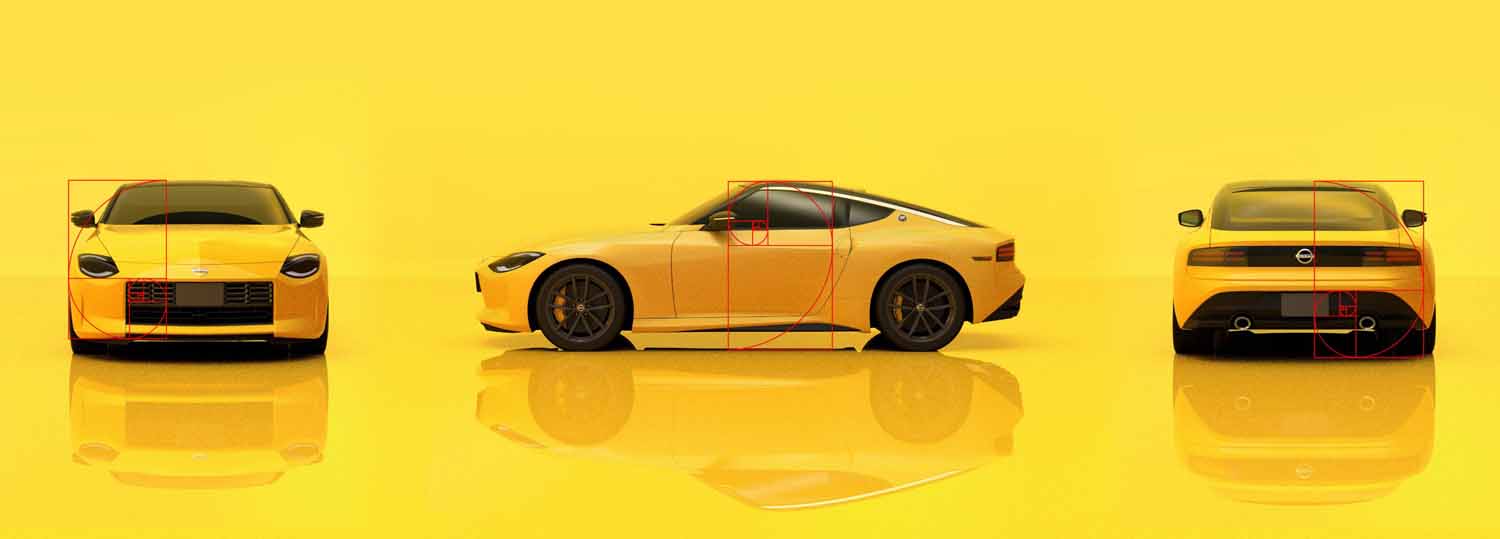 Front and rear ride height/body styling and exterior door: The Golden Ratio, often called the most beautiful number in the universe, is a mathematical expression that can be seen in nature, such as a Nautilus shell, and also in art, such as masterpieces by Leonardo da Vinci, architecture, and even music. On the all-new Z, elements of the front and rear, window height and door panel utilize the Golden Ratio to impress a natural beauty and pleasing aesthetic to all.
