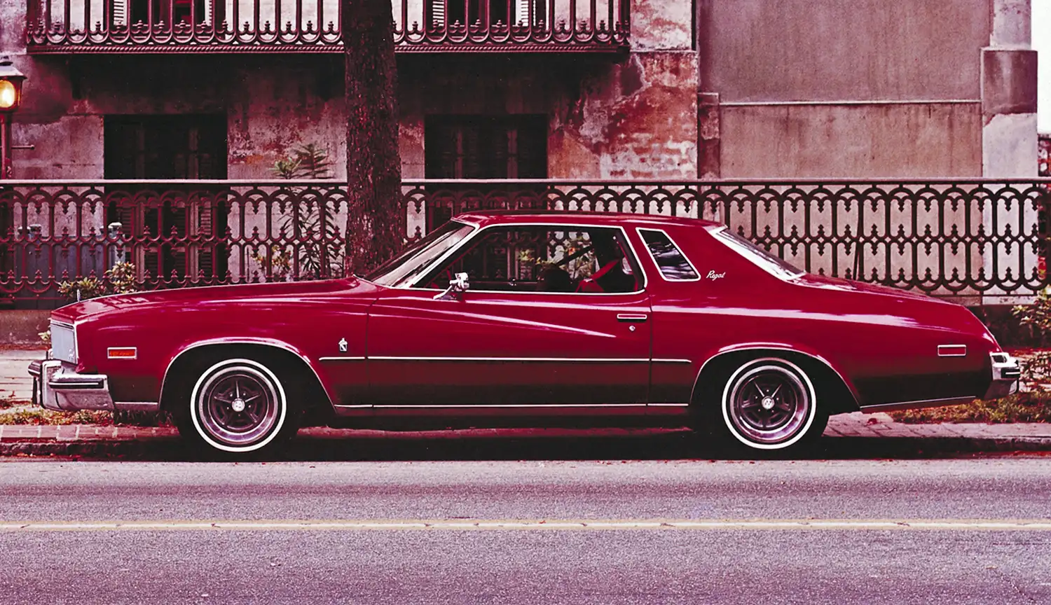 Large swooping body lines and opera windows were among Regal’s fashion cues at the start of the personal luxury era. The 1975 Regal was the only mid-size car in the United States to come standard with an efficient V-6 engine while maintaining comparable V-8 performance.