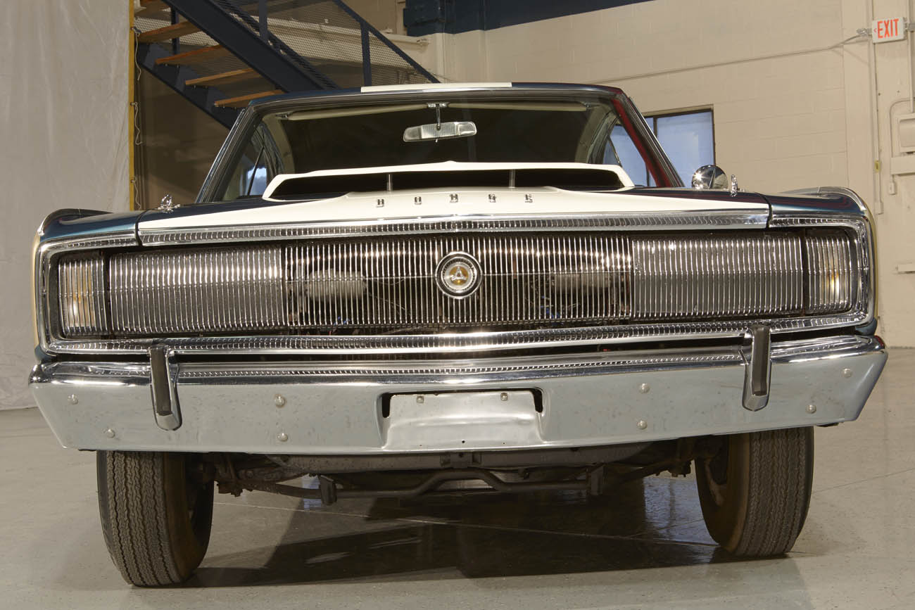 Minor updates were added to the Dodge Charger in 1967, including the addition of small front fender turn indicators and a vinyl roof option. Underneath the crisp two-door styling, a collapsible steering column and dual-system master cylinder became standard equipment to meet the arrival of U.S. Federal Safety regulations.