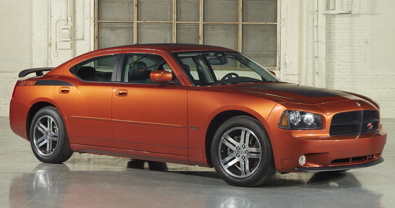 Later in the 2006 model year, the Dodge Charger R/T Daytona returned, this time with performance to back up its storied nameplate. In addition to high-impact paint colors “Go ManGo!,” “Top Banana” and “TorRed,” the 2006 Dodge Daytona R/T limited-edition model featured a performance exhaust with a 350 horsepower HEMI V-8 engine with HEMI orange engine cover, performance seating with perforated suede, performance-tuned suspension with height control, 18-inch polished aluminum wheels with black-painted pockets, front fascia with chin spoiler, rear air diffuser, black honeycomb grille, unique black “Daytona” and “HEMI” decals, black rear deck-lid spoiler and signature heritage R/T badge in red.
