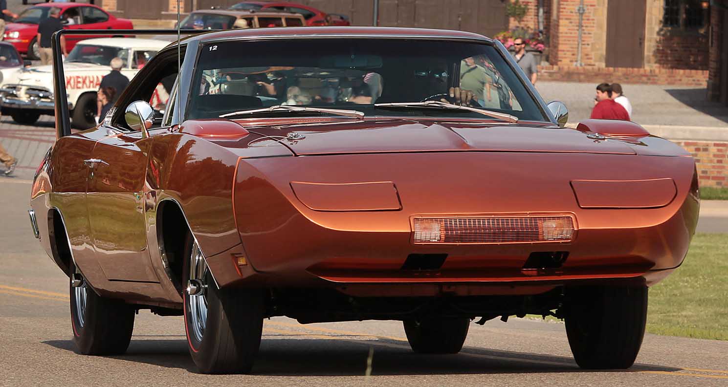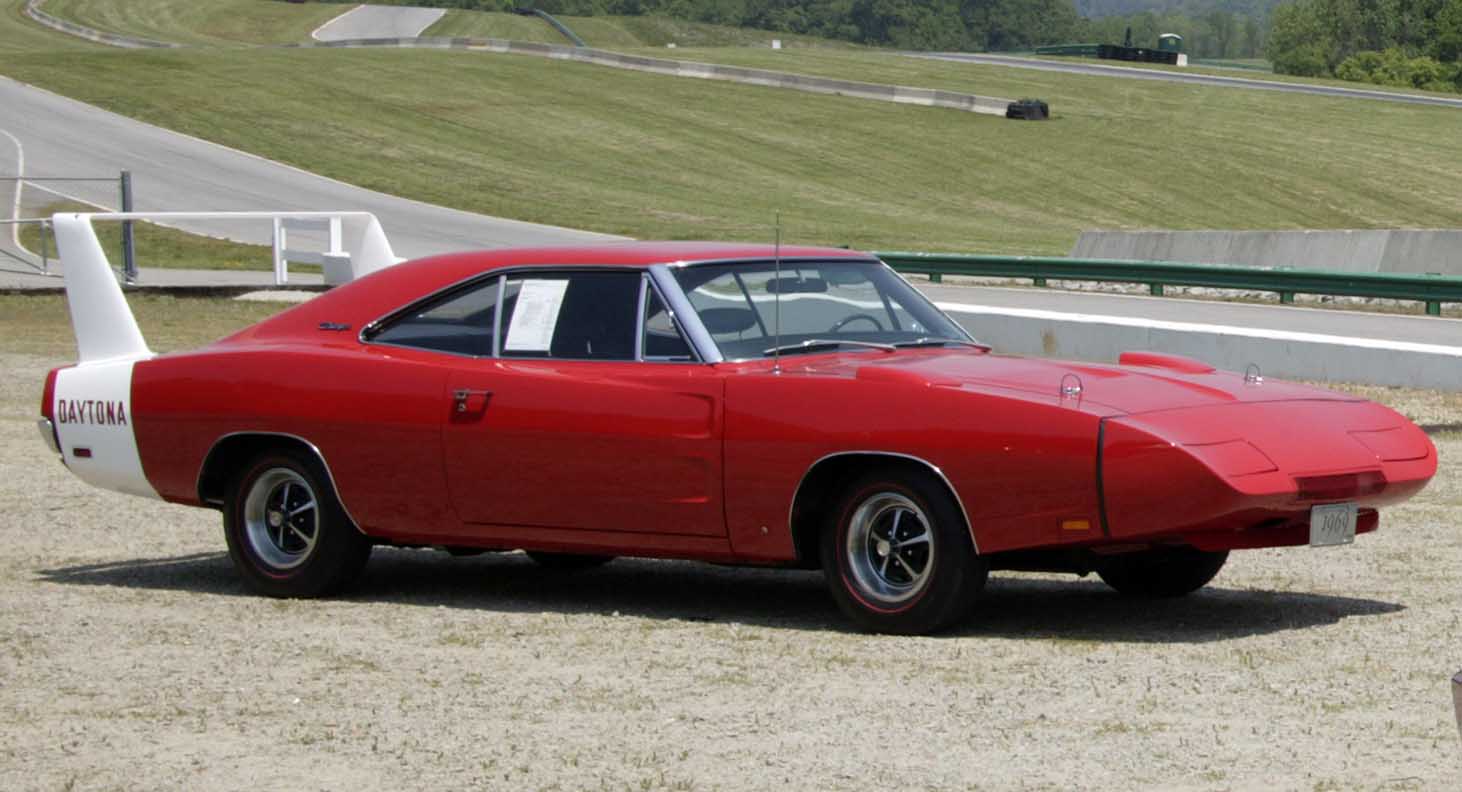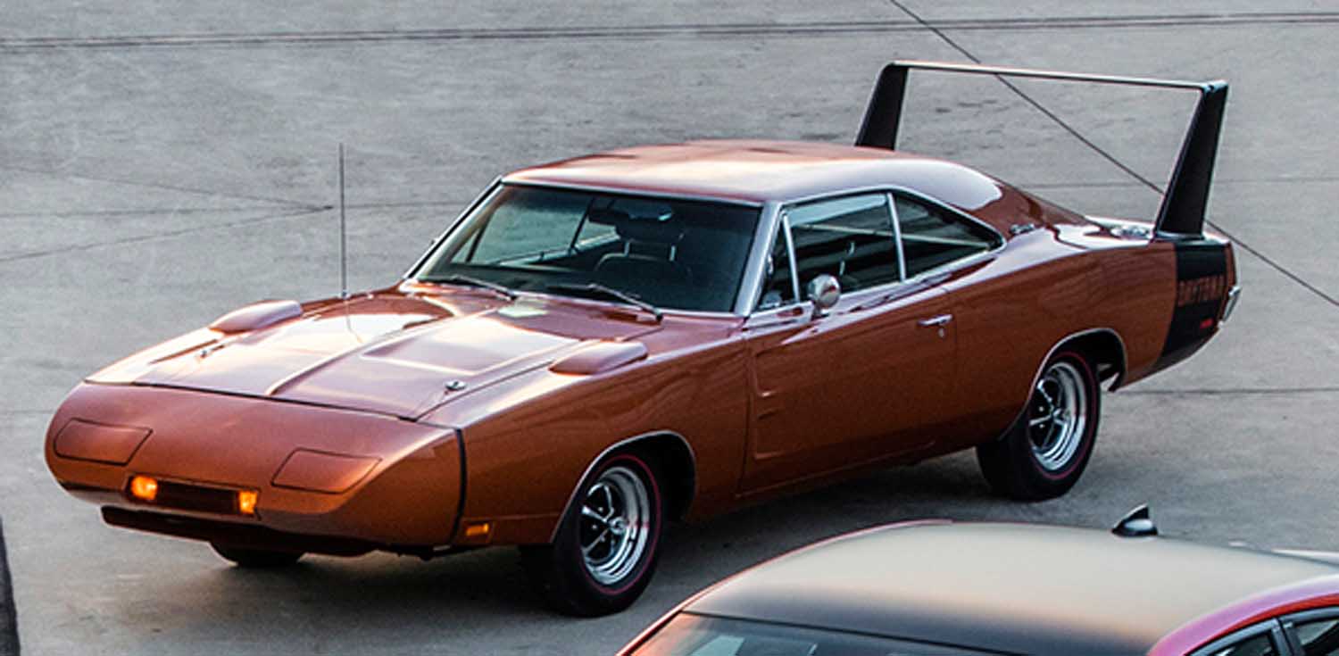 One of the two famous aero-cars, the Dodge Daytona had featured special body modifications that included a 23-inch-tall (584 mm) stabilizer wing on the rear deck, a special sheet-metal “nose cone” that replaced the traditional upright front grille, a flush rear backlight (rear window area), a ‘window cap’ to cover the original Charger’s recessed rear window, specific front fenders and hood that were modeled after the upcoming 1970 Charger, stainless steel A-pillar covers and fender mounted cooling scoops. The Daytona was built on the 1969 Charger’s R/T trim specifications, meaning that it carried a heavy-duty suspension and brake setup and was equipped with a 440 cu in (7.2 L) Magnum engine as standard. Of special note to collectors is the optional 426 cu in (7.0 L) Hemi V8 engine, which only 70 of the 503 Daytonas carried. It had a corporate cousin in the “one year-only” 1970 Plymouth Superbird and with help of Chrysler’s missile engineers, the Charger Daytona was born.