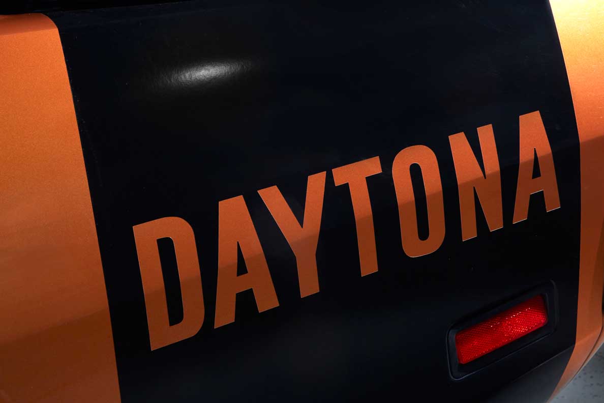 Available in a unique color palette of Daytona Blue, Bright White, Billet Silver, Pitch Black, or purple the Daytona package featured special dark trim that built upon the Charger’s iconic muscle car design. Satin Black adorned the front crosshair grille with heritage “R/T” badge, the custom vinyl hood graphic, roof wrap, rear R/T spoiler and the “DAYTONA” graphic on the rear quarter panels. It featured exclusive 20-inch five-spoke polished aluminum wheels with Gloss Black painted pockets.