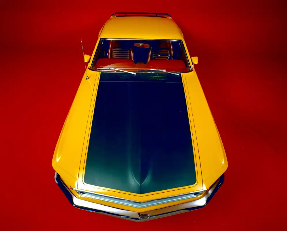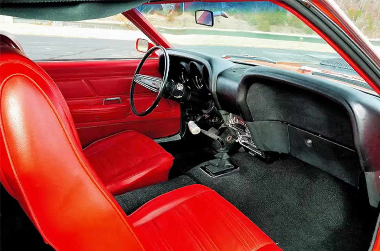 Such a large big block engine made the car nose heavy. To help offset this, the battery was relocated to the trunk, and a 3/4″ sway bar was added to the rear end to limit body roll. This was the first Mustang ever fitted with a rear sway bar, giving it better handling than the other large engine Mustangs of the time, making it a much more capable track car. So did an oil cooler which allowed both high RPM and endurance loads on the engine, and a manually controlled hood scoop for bringing in denser air for more thorough combustion. For better ground clearance the front spoiler was made shallower than the Boss 302’s, and a 3.91 ratio rear axle came with a “Traction-Lock” limited slip differential. Other features included, color keyed dual racing mirrors, an 8,000rpm tachometer, and AM only radio.