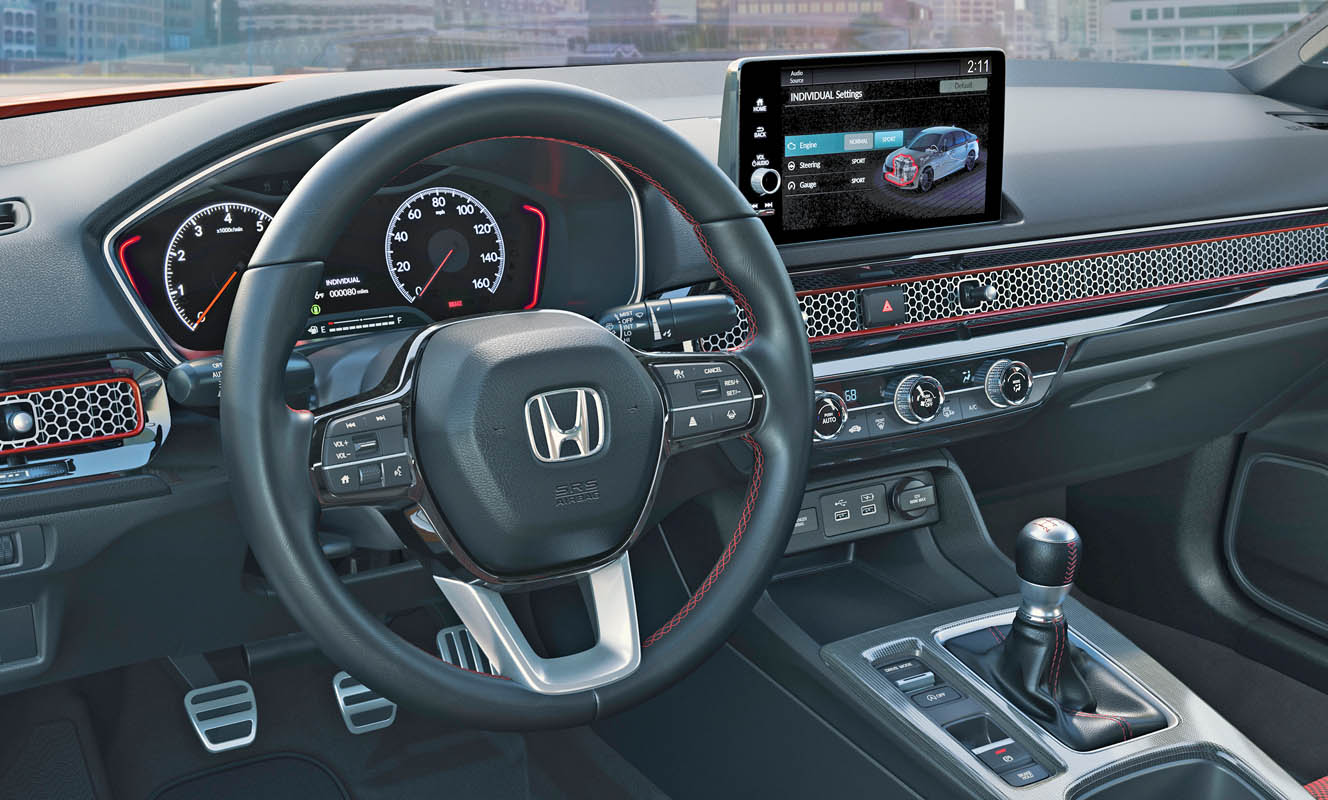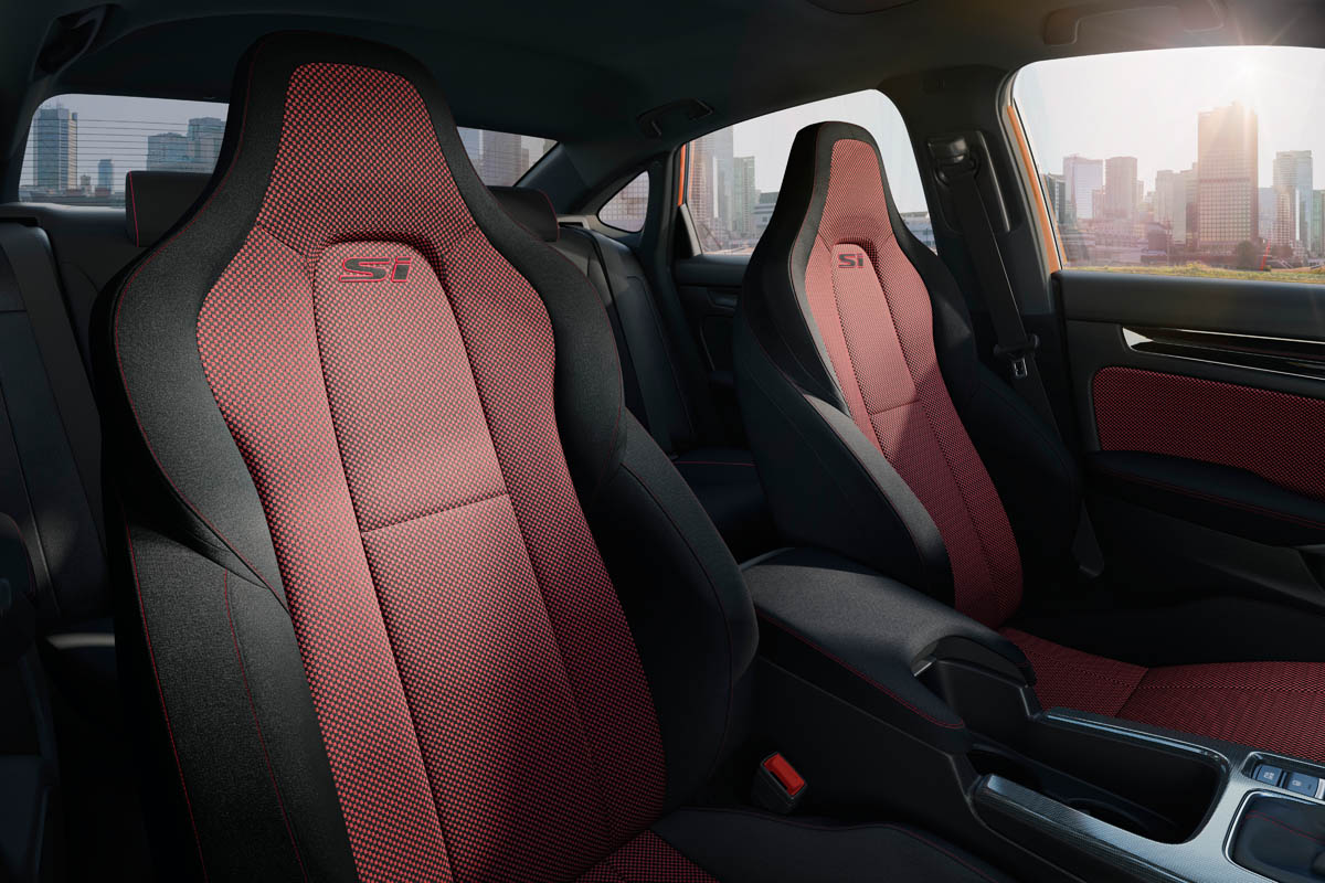 - The driver-focused interior features Si-specific body stabilizing sport seats with dynamic red accents and red contrast stitching
