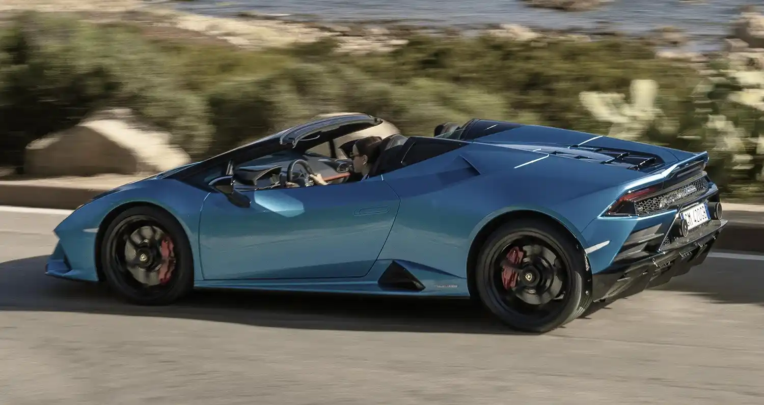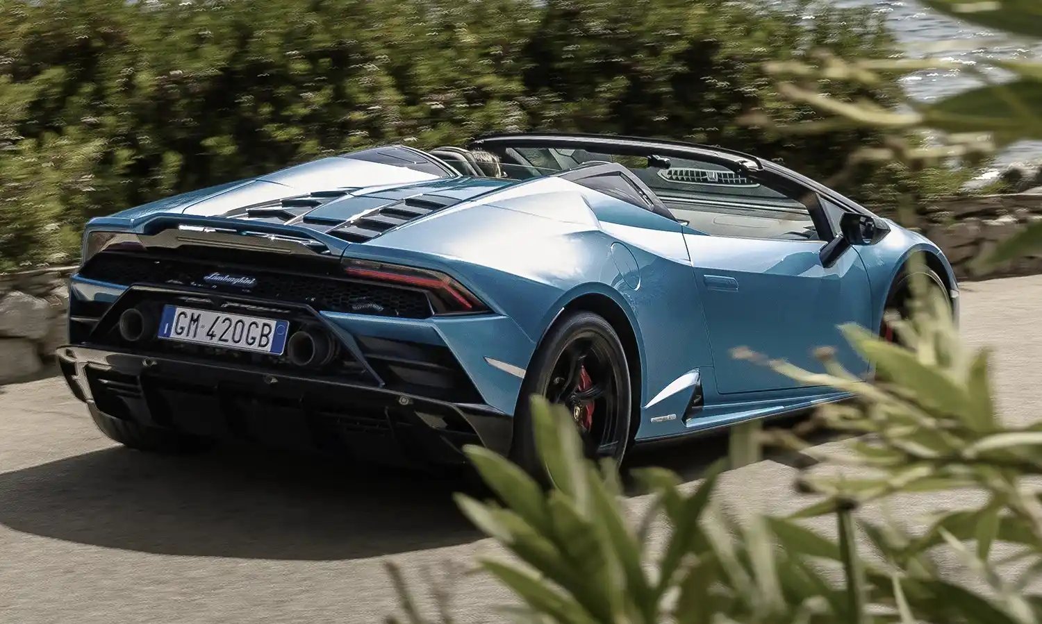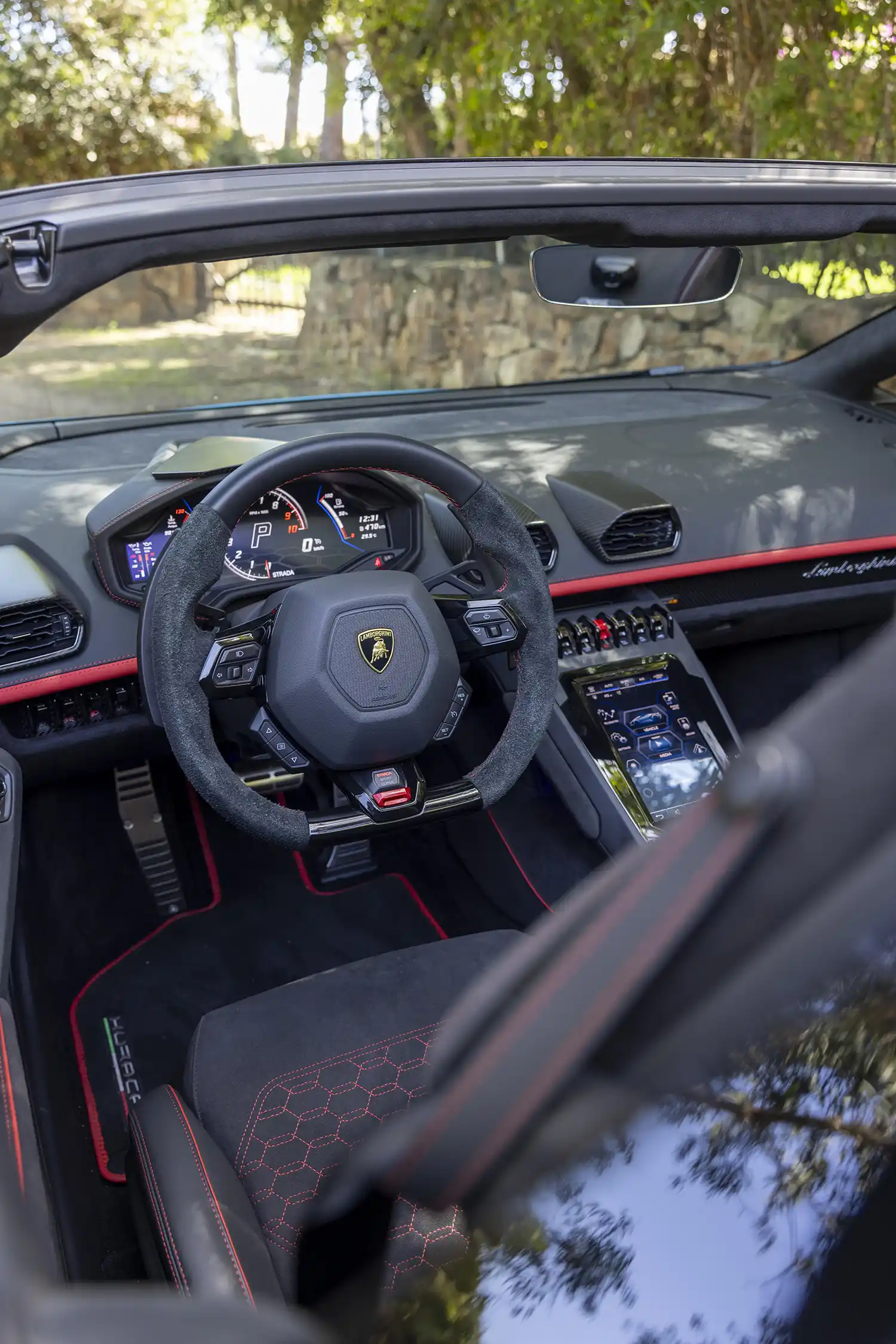 The Huracán EVO Spyder, introduced in 2019 is in Sardinia in Blu Aegir and Blu Cepheus and fitted with Nero Ade with Rosso Alala Q-Citura and Bianco Leda with Blu Cepheus Q-Citura interiors respectively. It’s the perfect-fit star for the Costa Smeralda roads: the Spyder combines the option of open-air driving with design appeal and a ened lifestyle experience, with the prowess of the Huracán EVO’s evolutionary technologies. The vehicle features a 640 HP engine, rear-wheel steering and a four-wheel torque vectoring system, which makes it extremely easy to drive while excelling as a highly responsive, fun super sports car.