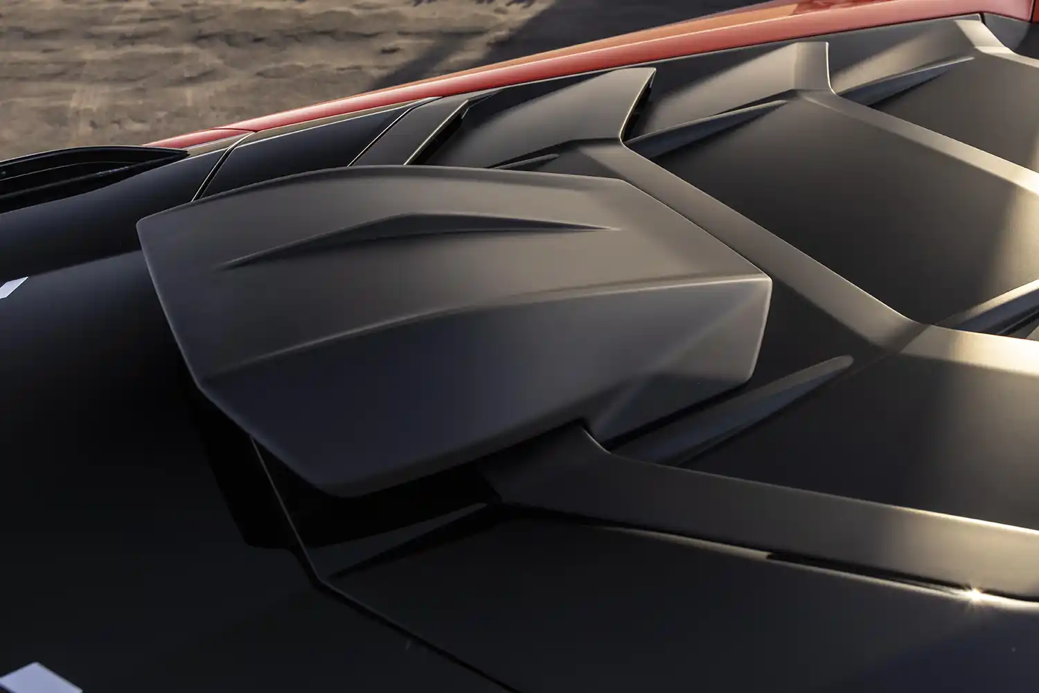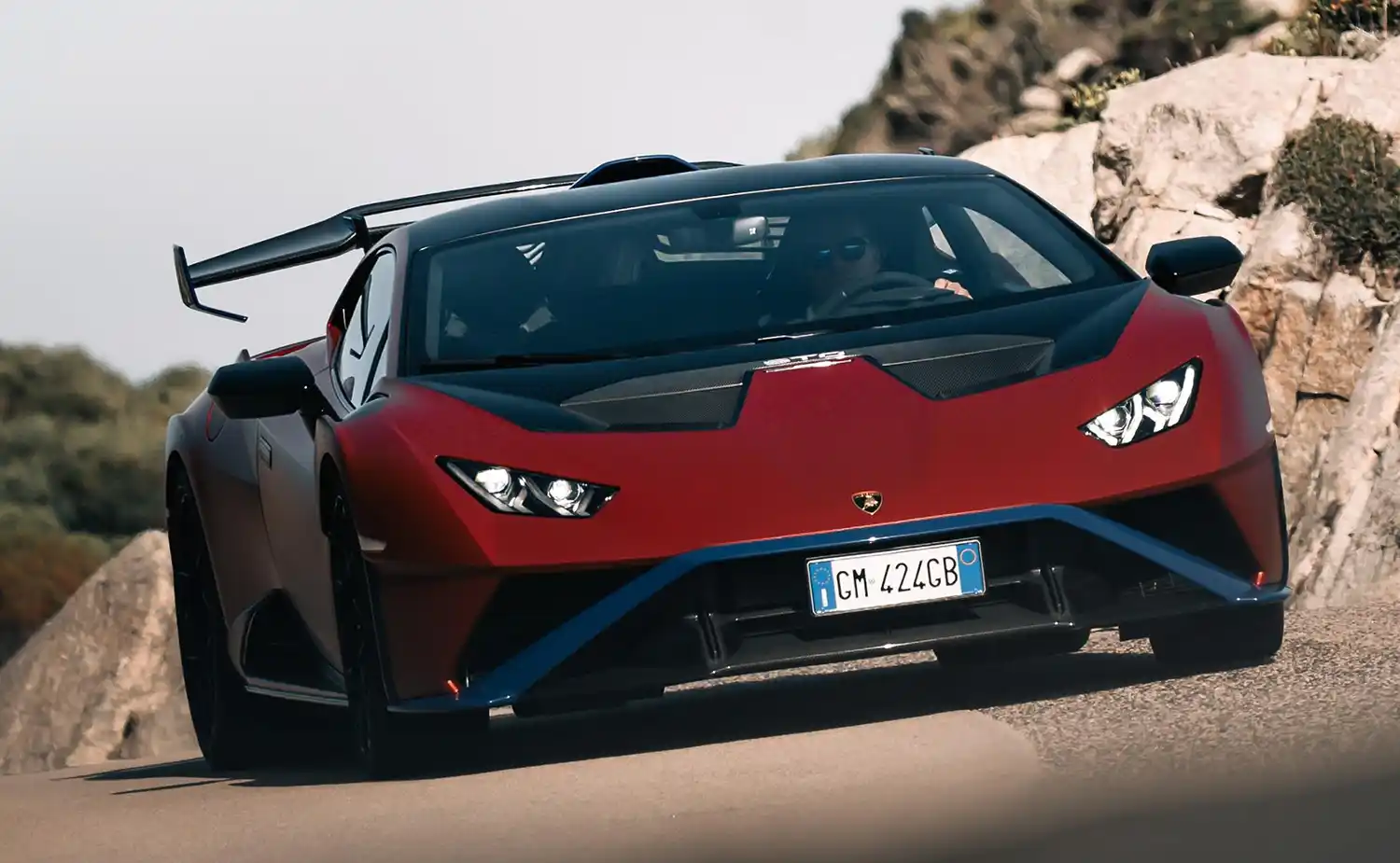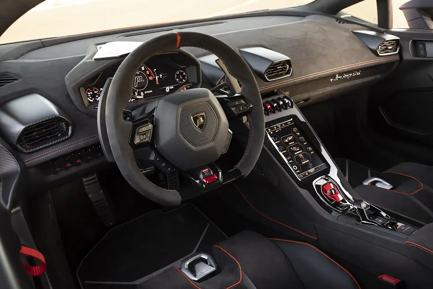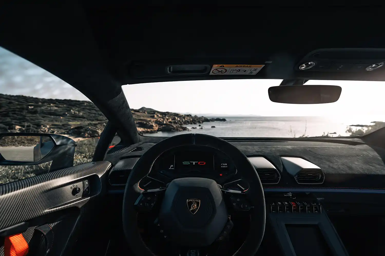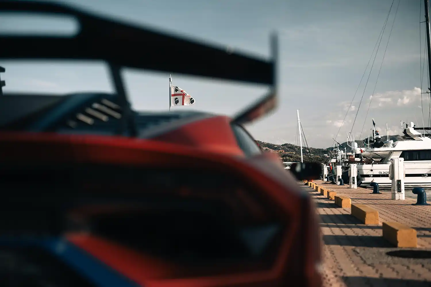 The Super Trofeo Omologata, unveiled in 2020, features Rosso Pyra and Rosso Epona external colours, with interiors in Nero Cosmus and Blu Sideris leather inserts with Rosso Alala stitching, and Nero Cosmus and Grigio Adamas stitching respectively. It is a road-homologated super sports car inspired by the racing heritage of Lamborghini Squadra Corse’s one-make race series, and an incarnation of a unique Lamborghini lightweight solution with superior aerodynamics and race car engineering. The 640 HP engine, extremely aerodynamic and lightweight body and rear-wheel drive create the most authentic driving feeling, even more on winding Sardinian roads.