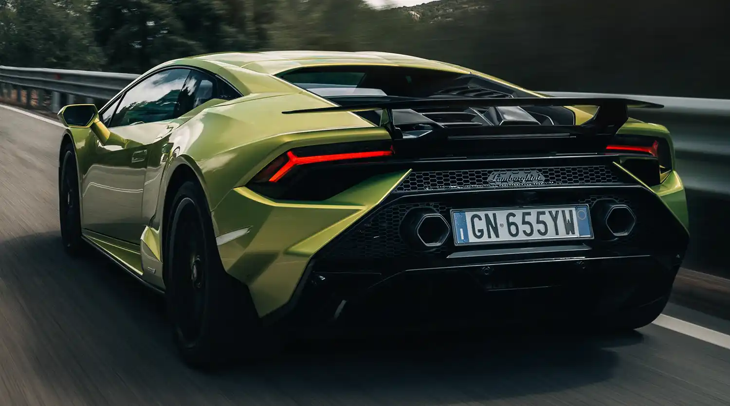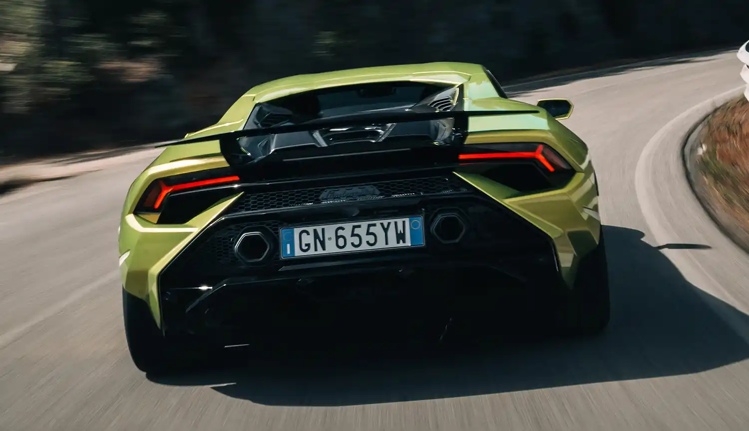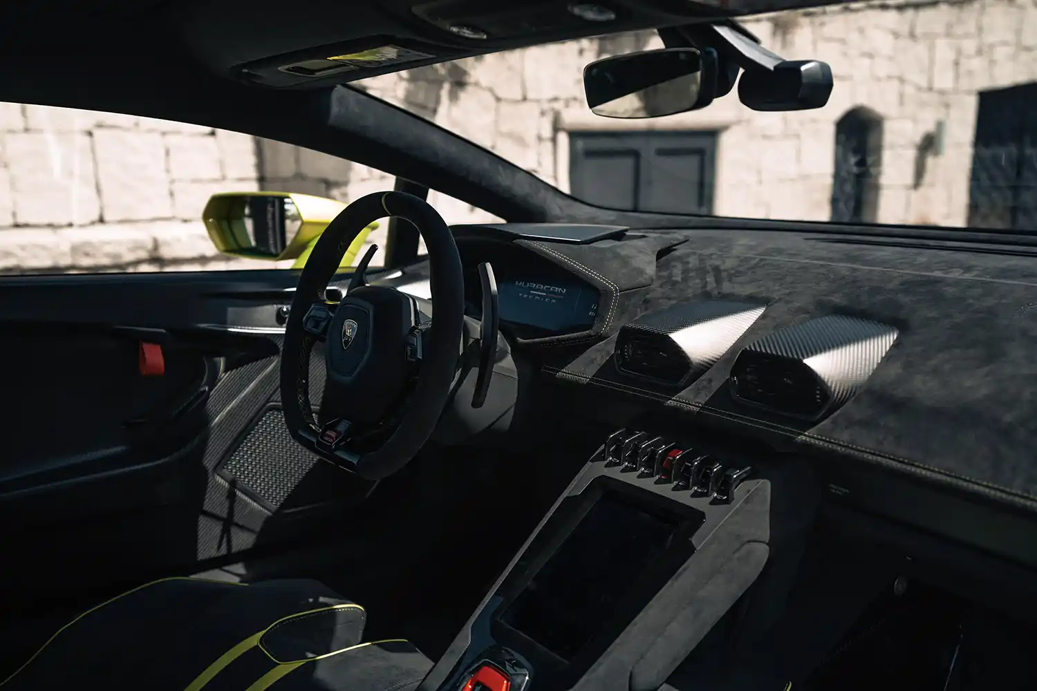 Huracán Tecnica, presented in 2022, is seen in Verde Citrea and Blu Astraeus with interiors in Nero Ade and Bianco Leda stitching and Nero Ade and Verde Scandal stitching respectively. Tecnica is a car developed for pilots seeking driving fun and lifestyle perfection on both on track and road. The vehicle accents improved aerodynamics, an evolved design. and ened ease of use with rear-wheel drive and rear-wheel steering: combined with the 640 HP engine taken from the Huracán STO, Tecnica is the perfect fun-to-drive companion for a track session or an exhilarating journey by road.