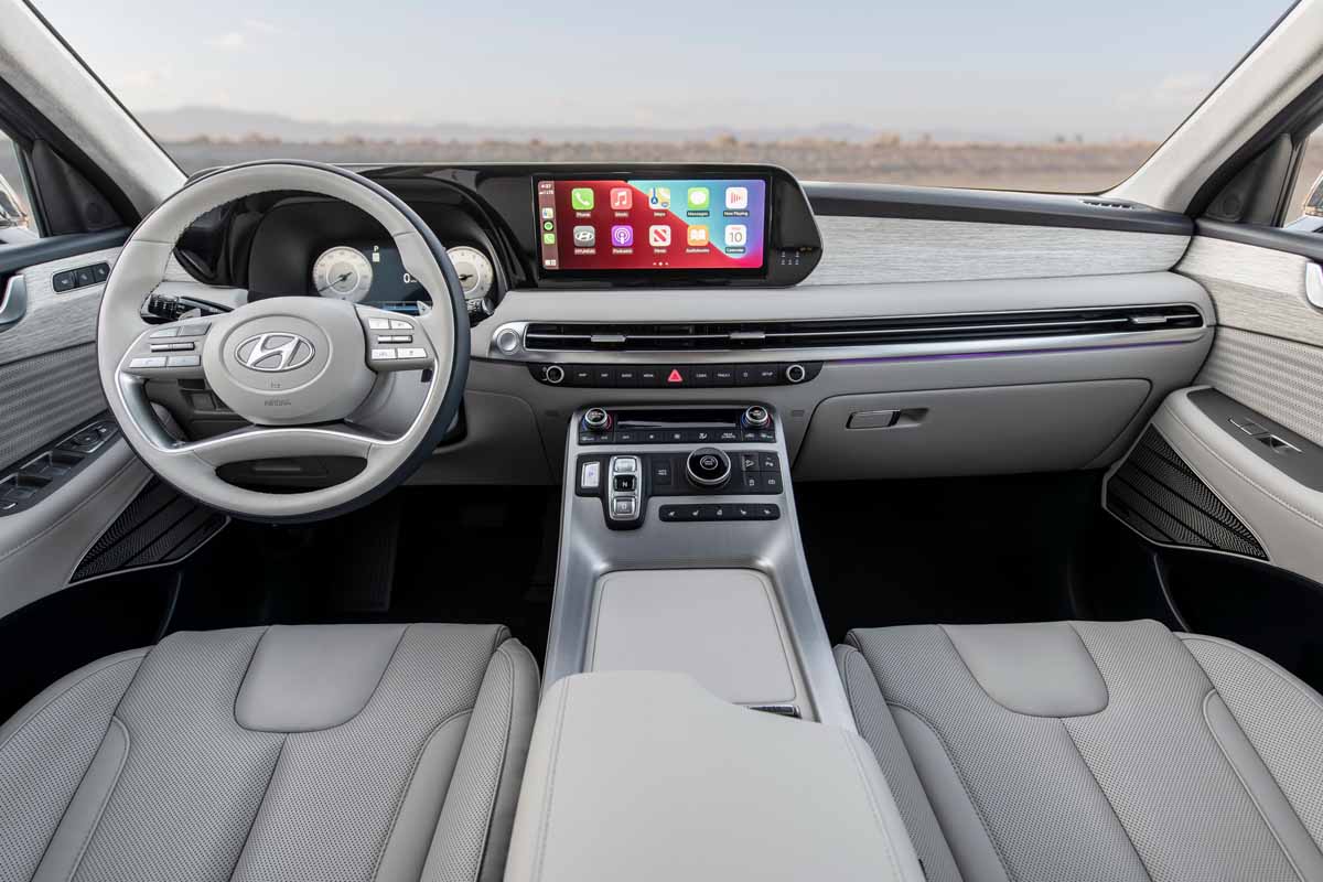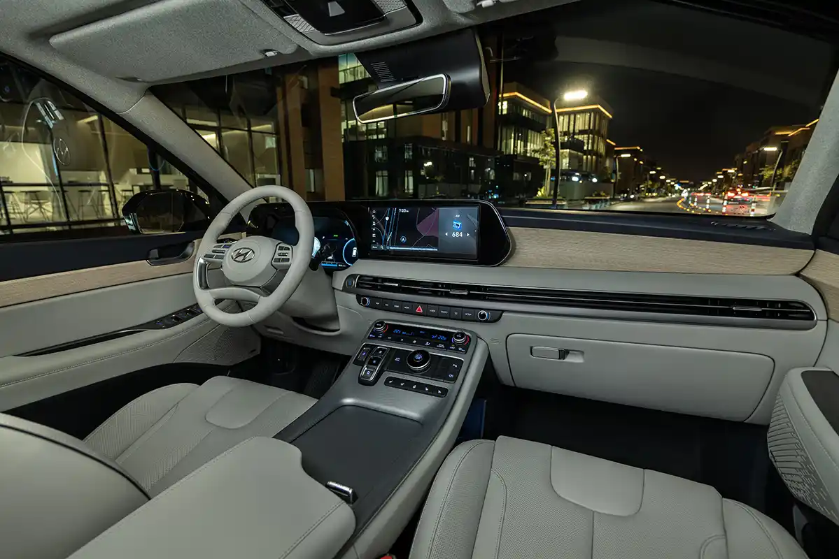 The new 2023 Palisade comes now with many drivers and passenger comfort and convenience novelties; the novel Ergo driver’s seat, which provides designed to provide comfort and help reduce fatigue during long drives. Passengers in the 2nd row now enjoy enhanced comfort with the added wing-out headrests and seat ventilation for extra comfort. Another smart tech feature meant for more driver convenience, is the optional full display “digital center” rearview mirror, which uses a rearview camera to allow the driver to clearly see behind the new Palisade without the obstructions of passengers or cargo. The large and user-centric 12-inch display boasts many applications and functionality, including smartphone connectivity and mirroring capabilities.