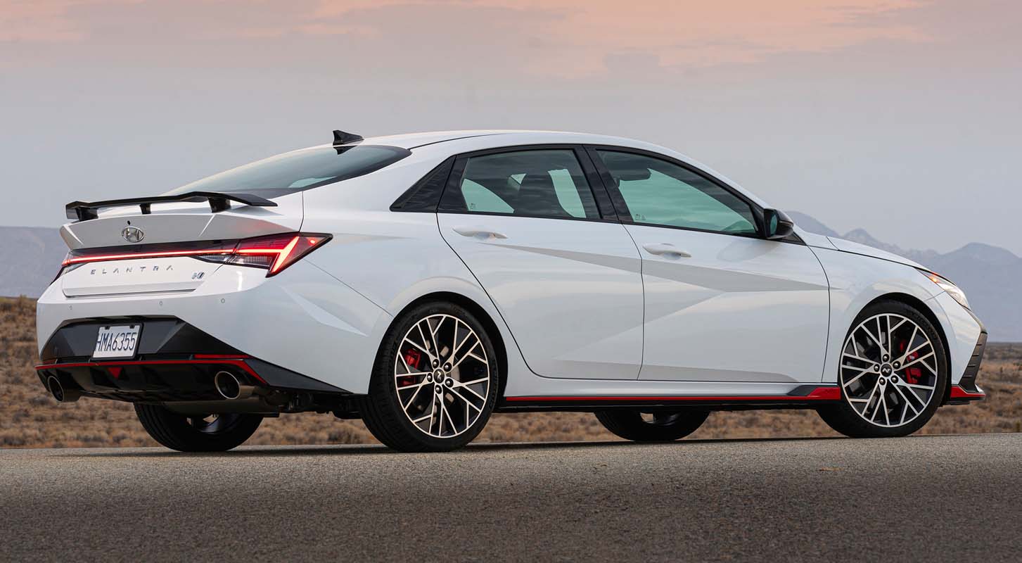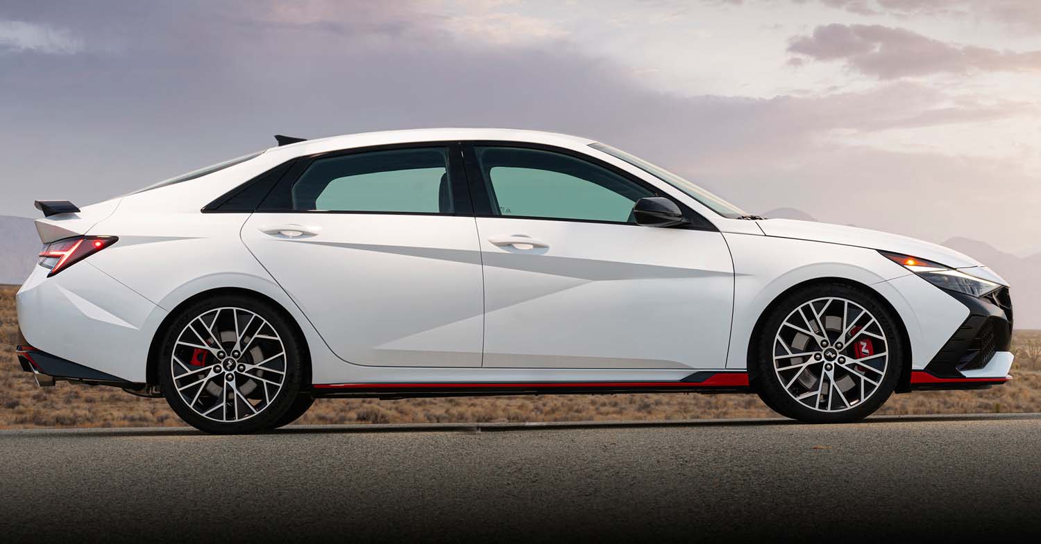 The N-exclusive red strip at the bottom of the front bumper continues along Elantra N’s side skirts, giving the hot sedan a racetrack-ready look.