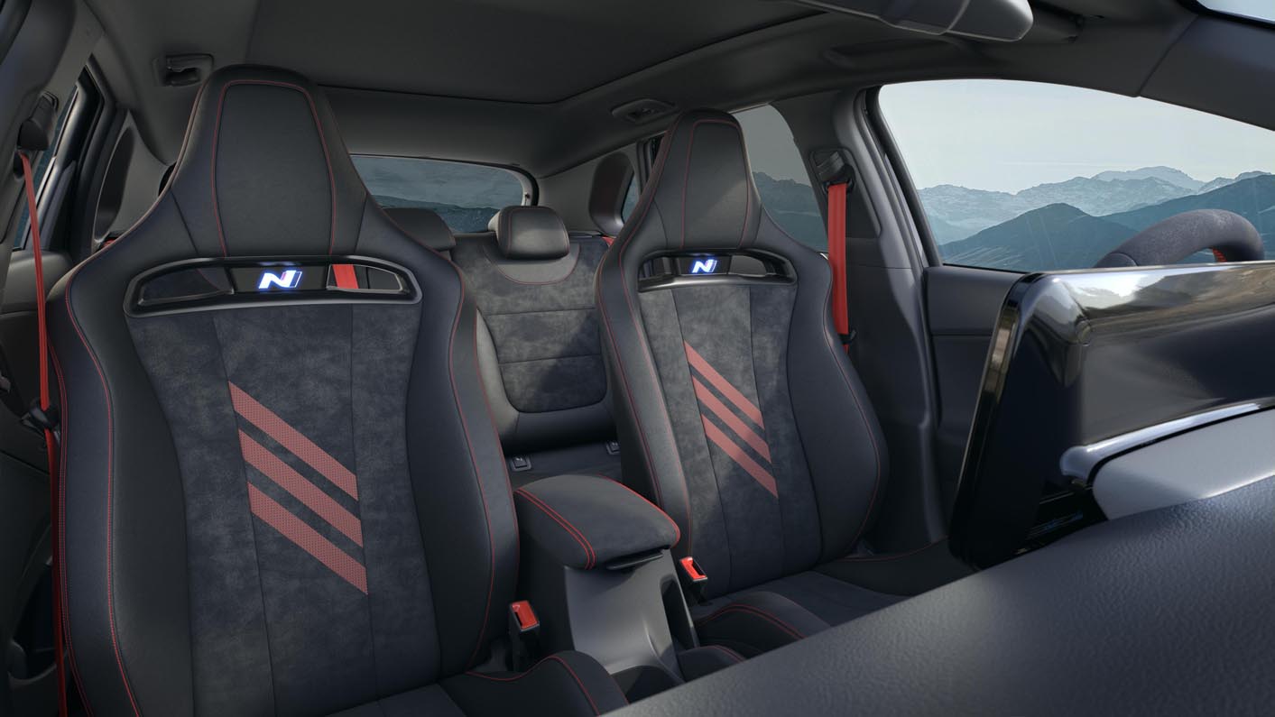 The interior of each unit is outfitted with a unique numbered badge, depicting its position among the limited volume of 800 total units. Instead of leather, Alcantara with red stitching will cover the steering wheel, gear lever, armrest, and handbrake. All accents decorating the interior will be in red colour. This applies to the seat belts in the front and rear, the steering wheel N buttons, the inserts and stitching of the N Light Seats with its new pattern. The i30 N Drive-N Limited Edition also has exclusive floor mats with specific lettering.
