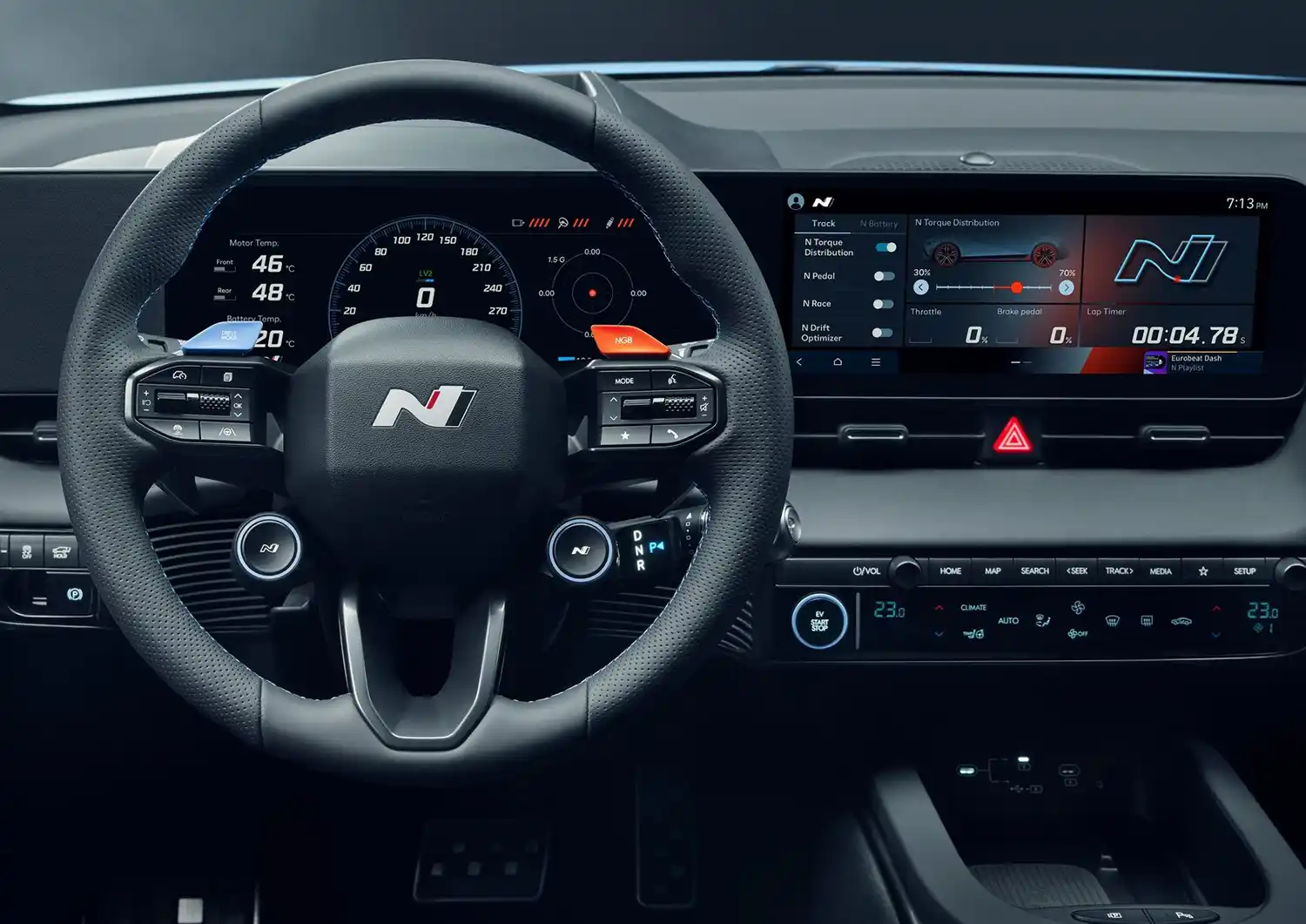 Several exclusive features aid track performance. N Grin Boost maximizes acceleration by a power increment of 10 seconds and N Launch Control provides three different traction levels for the fastest possible start, allowing drivers to launch their vehicle like a professional race car. Track SOC (state-of-charge) automatically calculates battery consumption per lap.