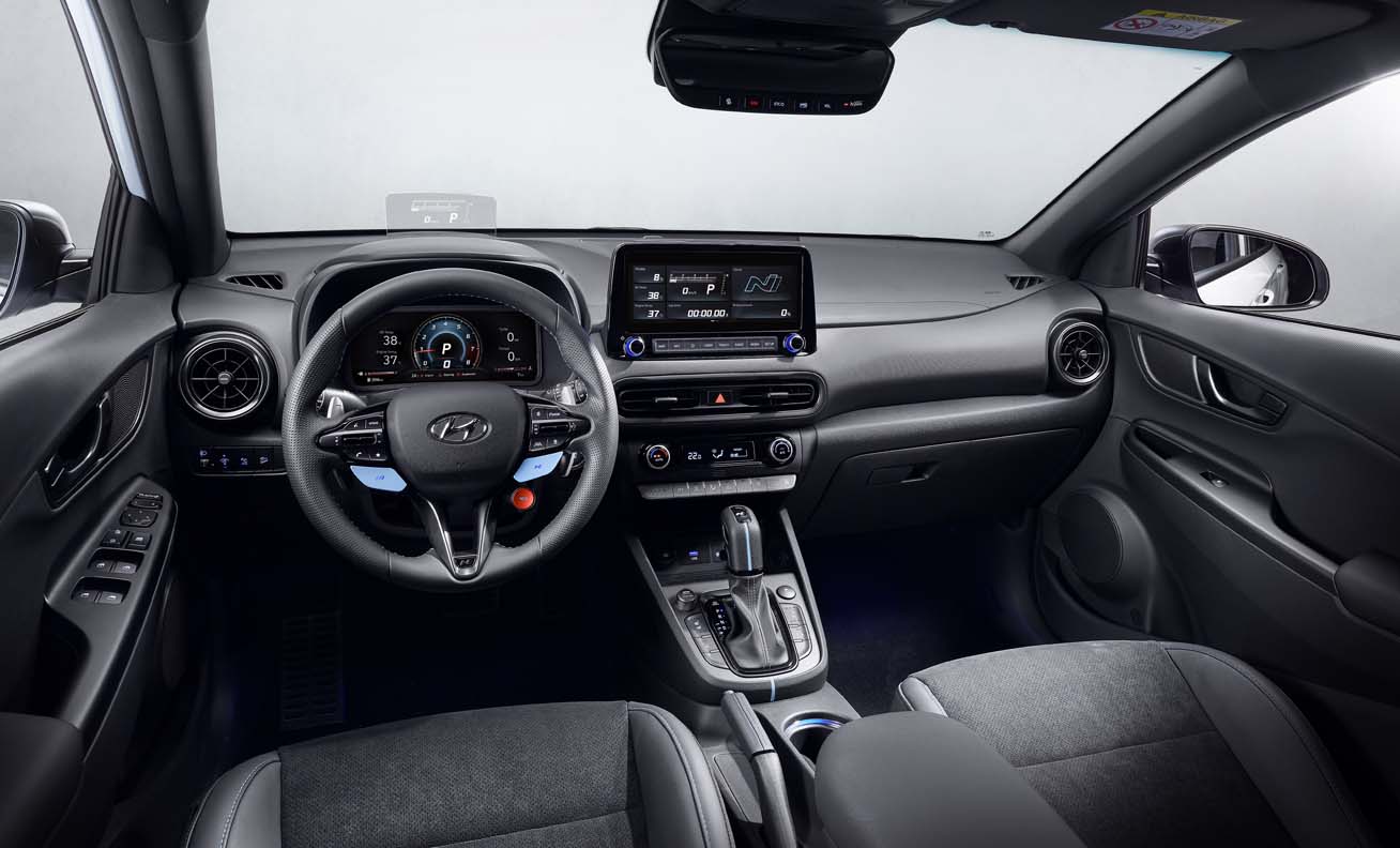 KONA N’s interior also conveys the N spirit with brand-specific details such as the Performance Blue color accents, seats, steering wheel, shift knob and metal pedals.