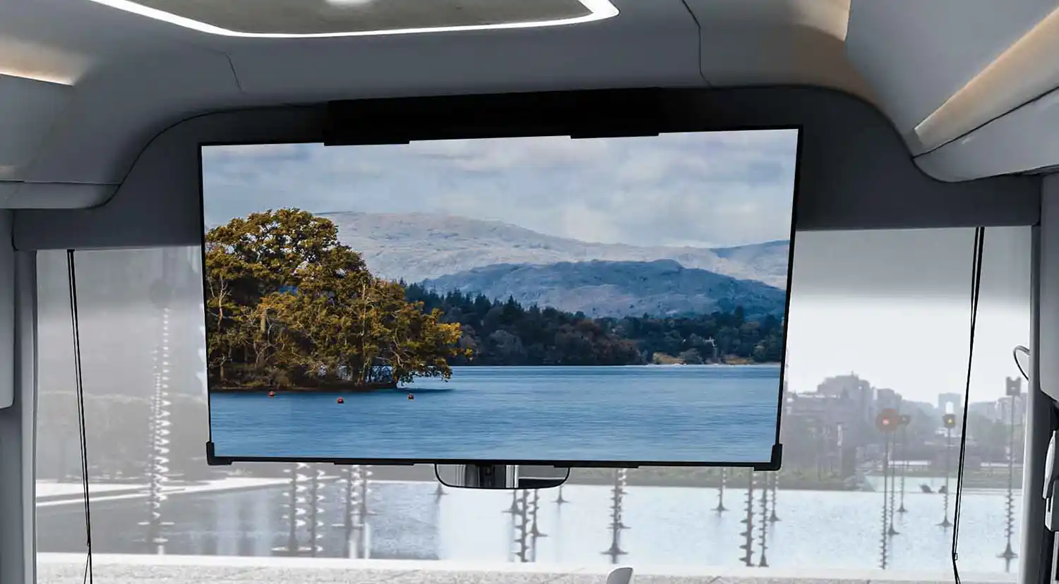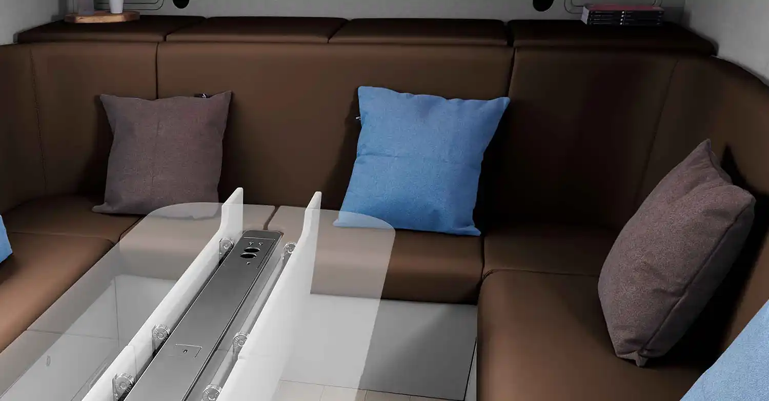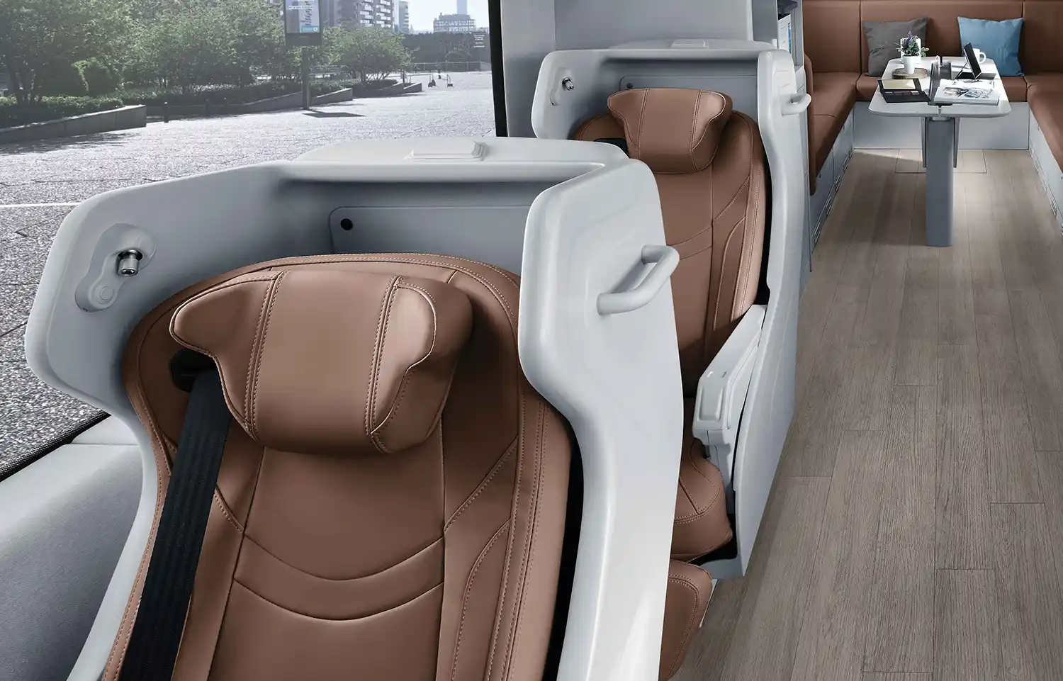 The vehicle’s interior uses the harmony of curves and straight lines to create an open-air office ambience with three distinct seating areas with premium yet practical design elements, such as semi-automatic blinds and light-colored laminated floors.