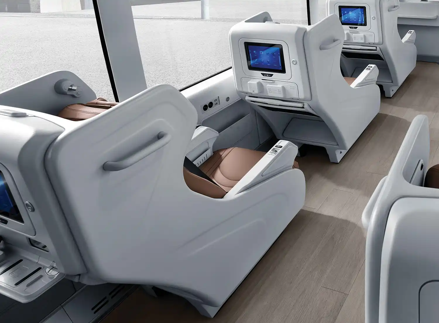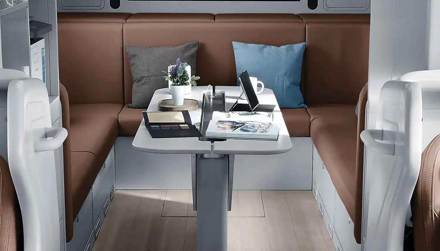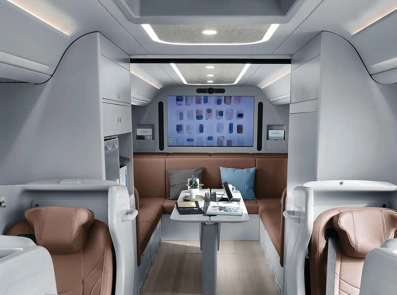 The personal workspaces in the middle are equipped with premium reclining seats, tables, wireless charging pads, individual entertainment systems and personal storage spaces to create a comfortable environment for work and relaxation in transit.