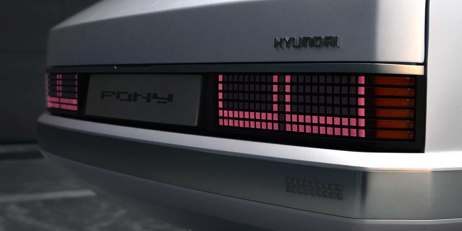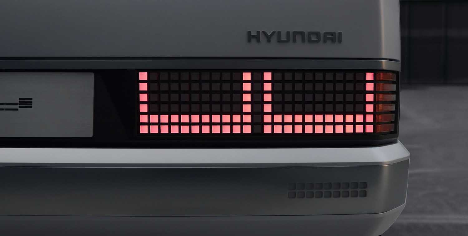 The Heritage Series PONY’s exterior is marked by a matte, shimmering surface of silver throughout front to rear part of the vehicle, hatchback silhouette. Notable features include camera-based, fender-mounted exterior mirrors to the fore of the windshield, pixelated round headlights and U-shaped taillights made of LED lights. The pixelated round headlights and U-shaped taillights embody the company’s ‘Pixel Road Trip’ design approach that incorporates pixels and eight-bit graphics also utilized in the IONIQ 5 and 45 concept car.