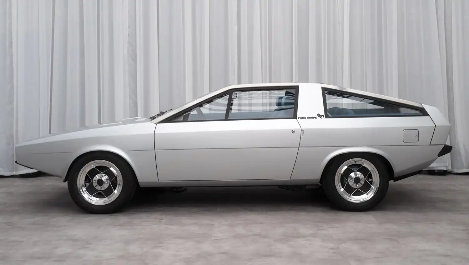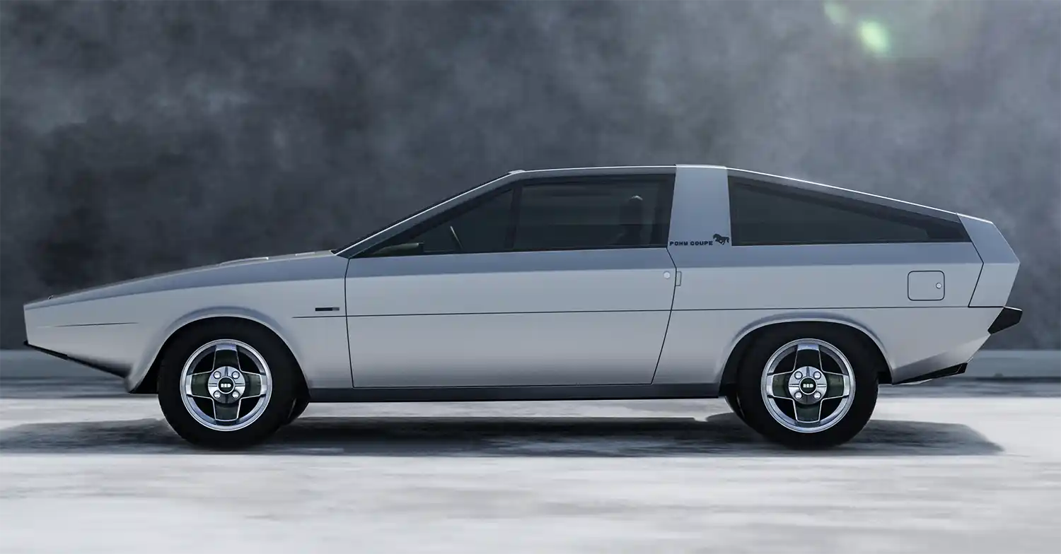 The Pony Coupe Concept’s origami-like exterior features flowing geometric lines, a sleek roofline, pure unadorned surfaces, dynamic proportions, a uniquely shaped B pillar. It boasts an extremely graphic surface treatment with bumpers painted in body color. Its wedge-shaped snout and circular headlamps distinguished it in 1974 and still look ultra-stylish today. Its coda tronca (‘cut-off tail’) has a slim hatch to provide access to the back of the car.