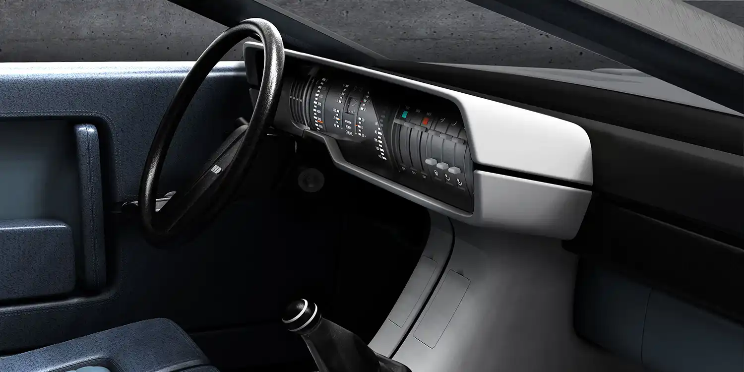 The minimalist interior showcases an iconic sensibility highlighting the monocoque design and driver-centered floating architecture. A single-spoke steering wheel and two-toned slim-line bucket seats reinforce what was in the 1970s a futuristic aesthetic.