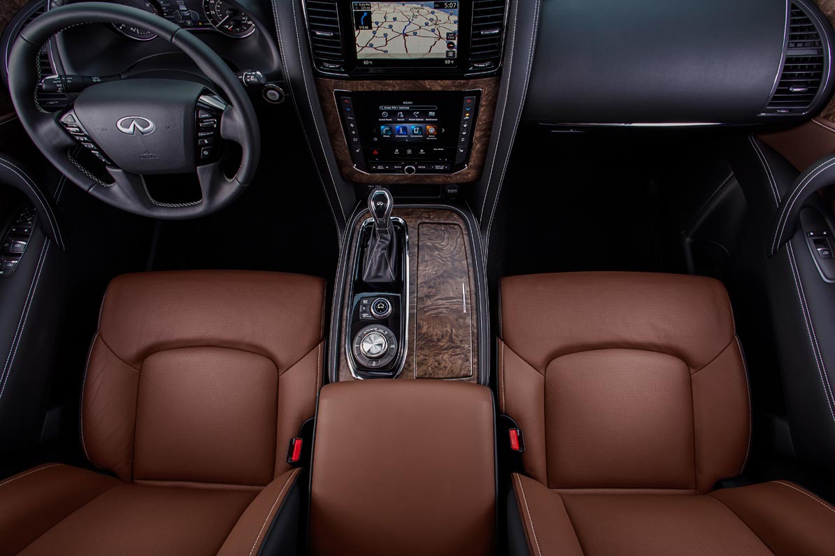 The new ‘PREMIUM SELECT’ grade brings a series of exterior trim enhancements first seen on the limited-run 2020 QX80 ‘Edition 30.’ Dark chrome and black highlights the QX80’s front grille, fender vents, door mirror caps and rear tailgate strip.