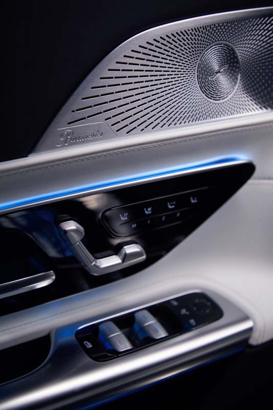 Similar to the centre console, the surfaces in the doors also develop fluidly from the instrument panel. The result is a gradient accentuated with decorative topstitching that frames the entire interior and runs past the turbine nozzles at the sides. The centre of the door is designed as a sensual layered topography. The pull handle is also designed in the same way as the centre console and is another eye-catching feature. The materiality and modelling of the surfaces are repeated in the doors, creating balance in the interior. High-quality Burmester loudspeakers in real metal, whose perforation pattern also stands out visually, are integrated into the doors.